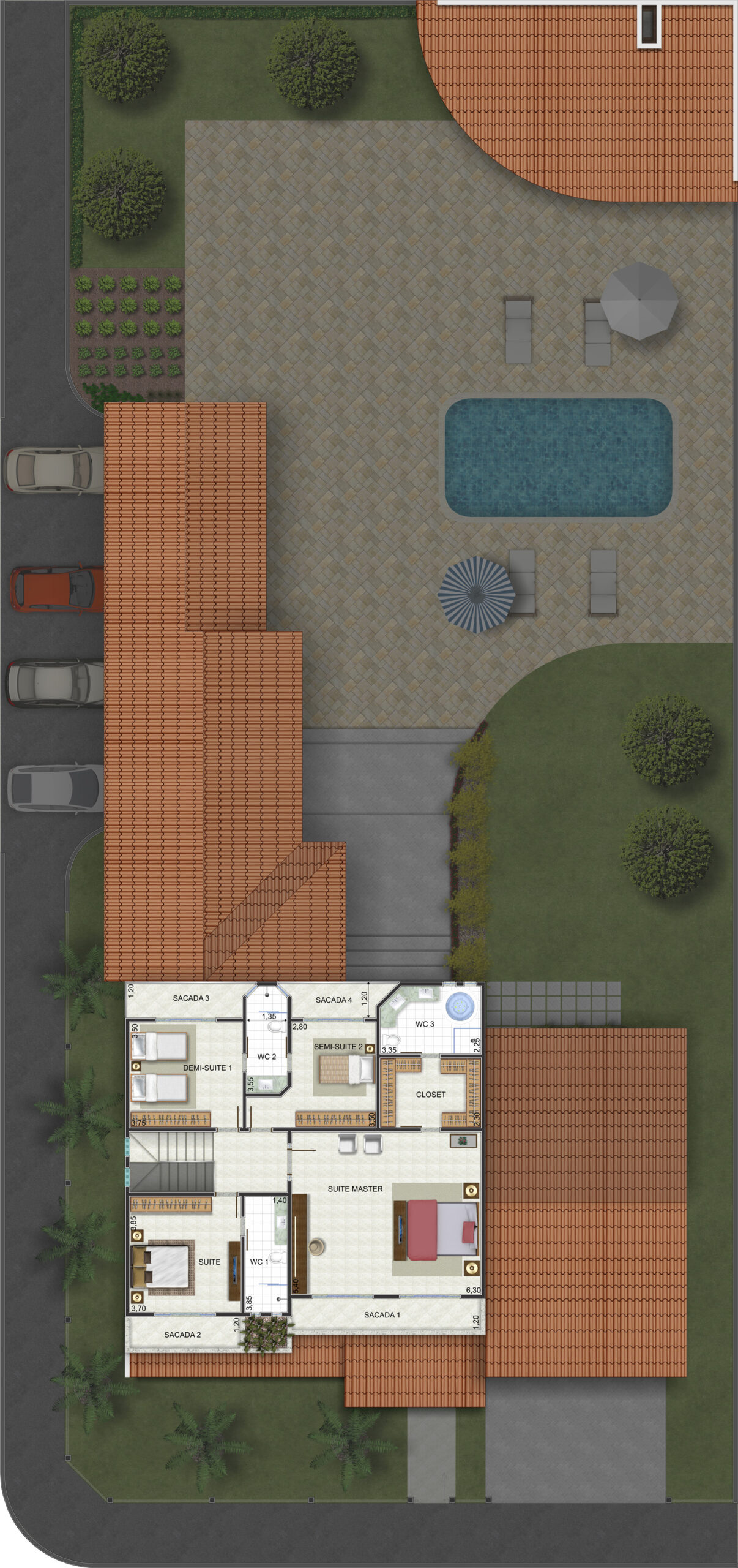 Distribuição interna inteligente No pavimento térreo, os ambientes são integrados e bem distribuídos: sala de estar, sala de jantar, cozinha funcional, sala de TV e hall de entrada. Há também uma loja e depósito, além de área de serviço e despensa. No pavimento superior, a suíte master possui closet e sacada privativa. Outras quatro suítes, incluindo demi-suítes e semi-suítes, garantem privacidade e conforto para todos os moradores. As sacadas adicionais ampliam a ventilação e iluminação natural.