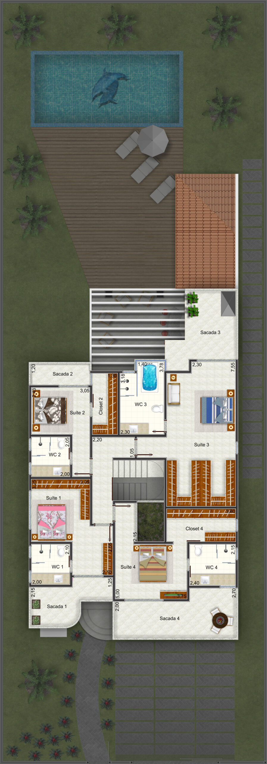 Suítes privativas e sacadas No pavimento superior, quatro suítes amplas oferecem privacidade e comodidade. Cada uma conta com banheiro exclusivo e sacada individual, proporcionando ventilação cruzada e iluminação natural. Os closets nas suítes principais agregam sofisticação e organização. A circulação entre os quartos é fluida, com destaque para o hall central e escada bem posicionada.