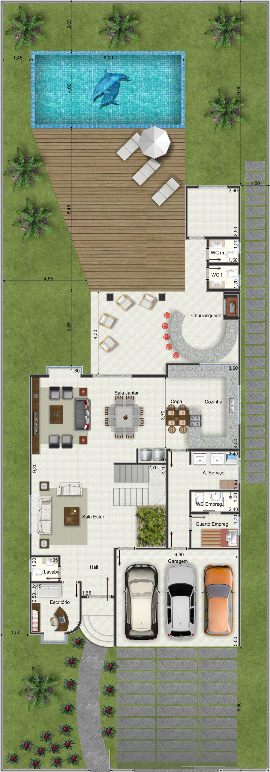 Ambientes sociais integrados No pavimento térreo, o destaque vai para a ampla sala de estar conectada à sala de jantar e à cozinha tipo americana. Essa integração favorece a convivência e proporciona maior fluidez entre os ambientes. O escritório, lavabo e hall de entrada completam os espaços internos, enquanto a área externa oferece piscina com design exclusivo em formato de golfinho, deck com espreguiçadeiras e guarda-sol, além de jardim paisagístico com palmeiras e plantas decorativas.