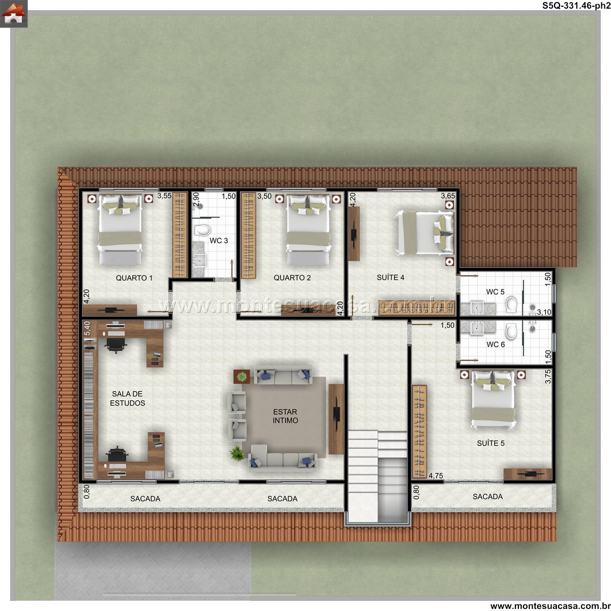 O pavimento superior é dedicado ao descanso e à privacidade da família, abrigando cinco quartos. Deste total, três são suítes, incluindo uma suíte master mais ampla. Os demais quartos compartilham um banheiro social bem localizado. Todos os dormitórios possuem acesso a sacadas, integrando os ambientes internos com a área externa e garantindo uma ótima iluminação natural. O terraço oferece um espaço de lazer adicional ao ar livre.