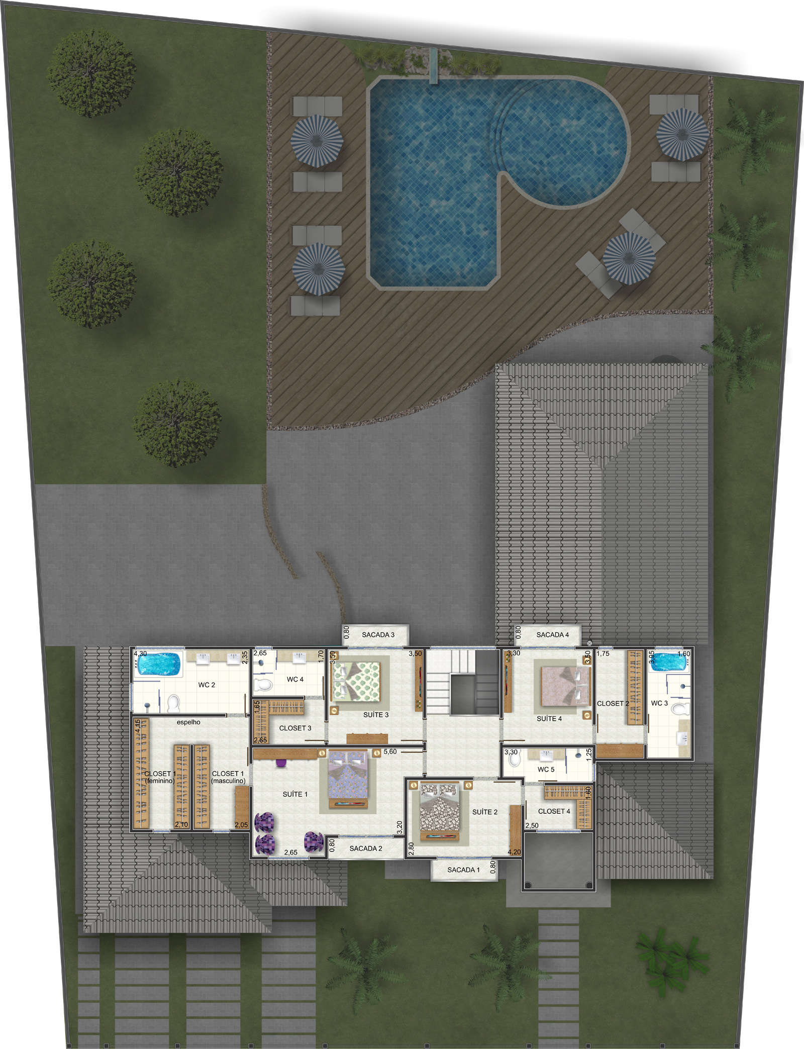 Pavimento superior com quatro suítes e varandas No andar superior, o projeto contempla quatro suítes confortáveis, cada uma com closet e banheiro privativo. As sacadas individuais proporcionam vista para o jardim e piscina, além de ventilação cruzada e iluminação natural. O layout favorece a privacidade dos moradores, sem comprometer a integração entre os ambientes.