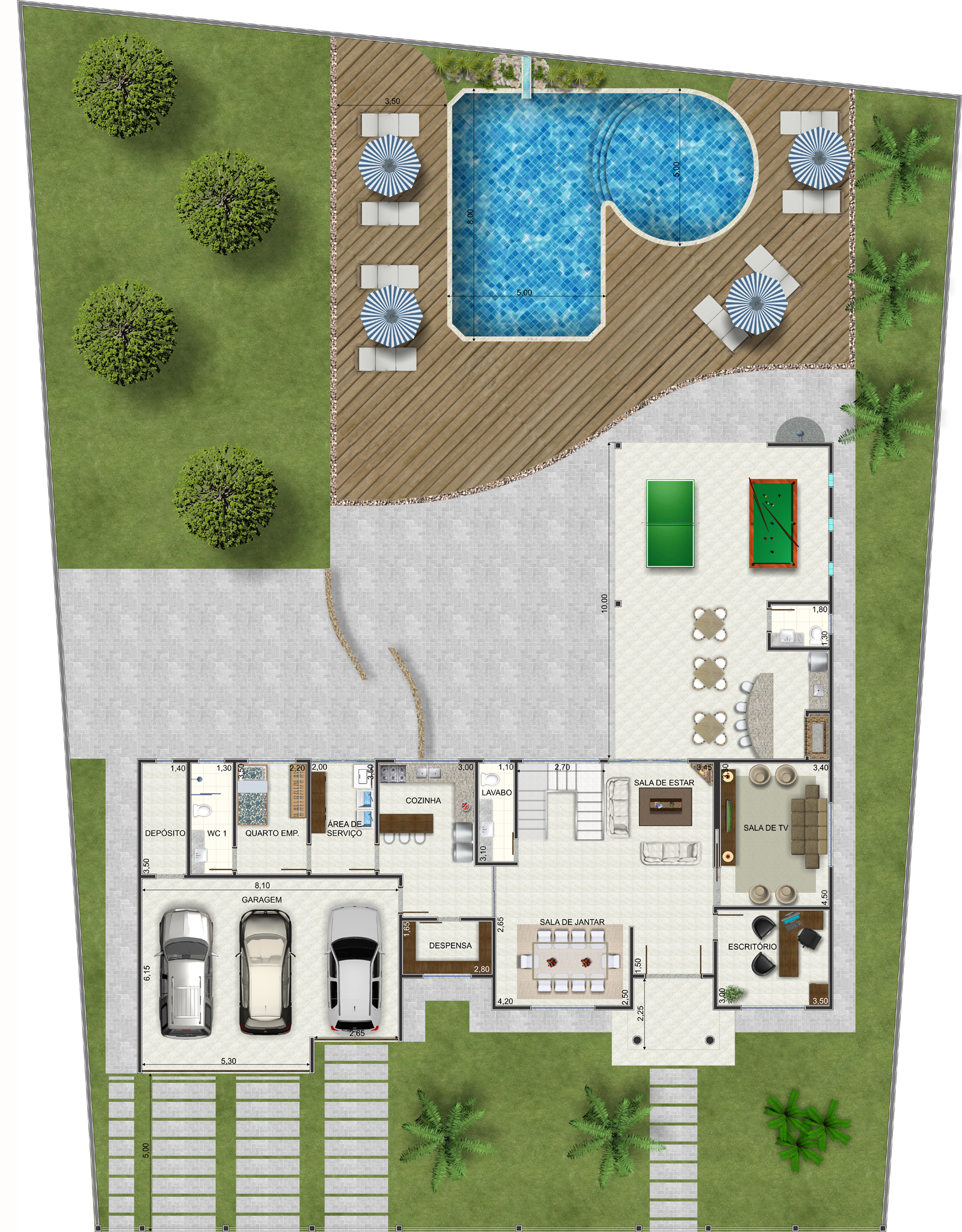 Área de lazer com piscina e deck de madeira A área externa é um dos grandes destaques do projeto. Um deck de madeira elegante envolve a piscina, criando um espaço ideal para relaxamento e convivência. Espreguiçadeiras, guarda-sóis e paisagismo com árvores e plantas completam o cenário, tornando-o perfeito para momentos de lazer ao ar livre.