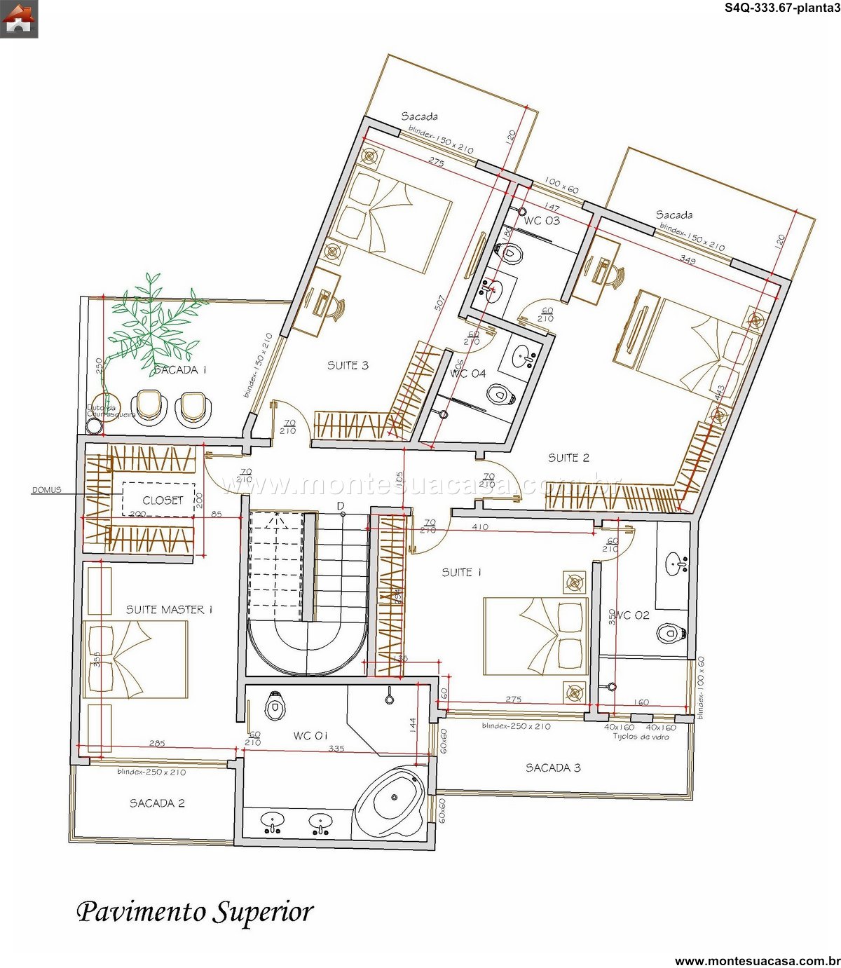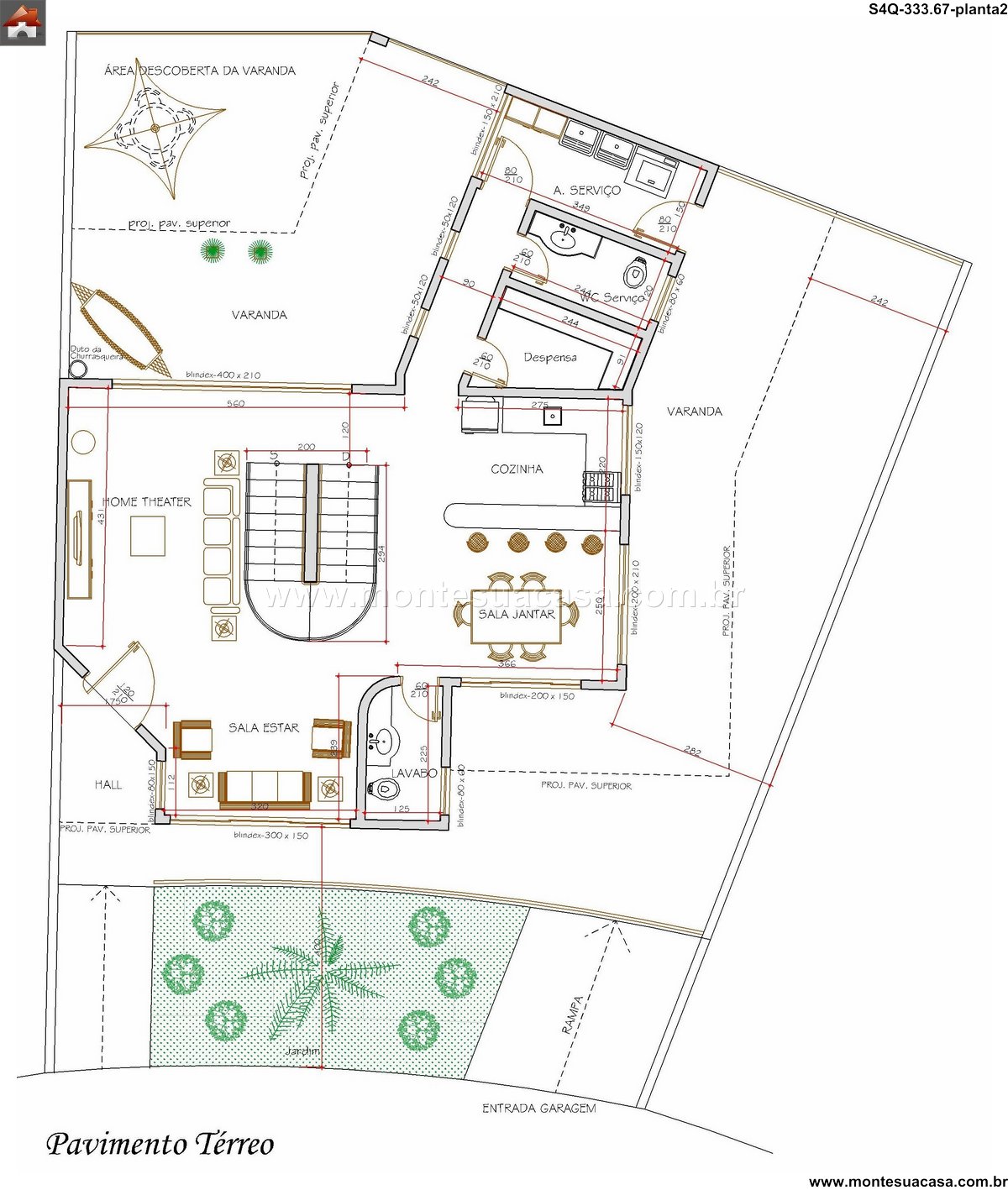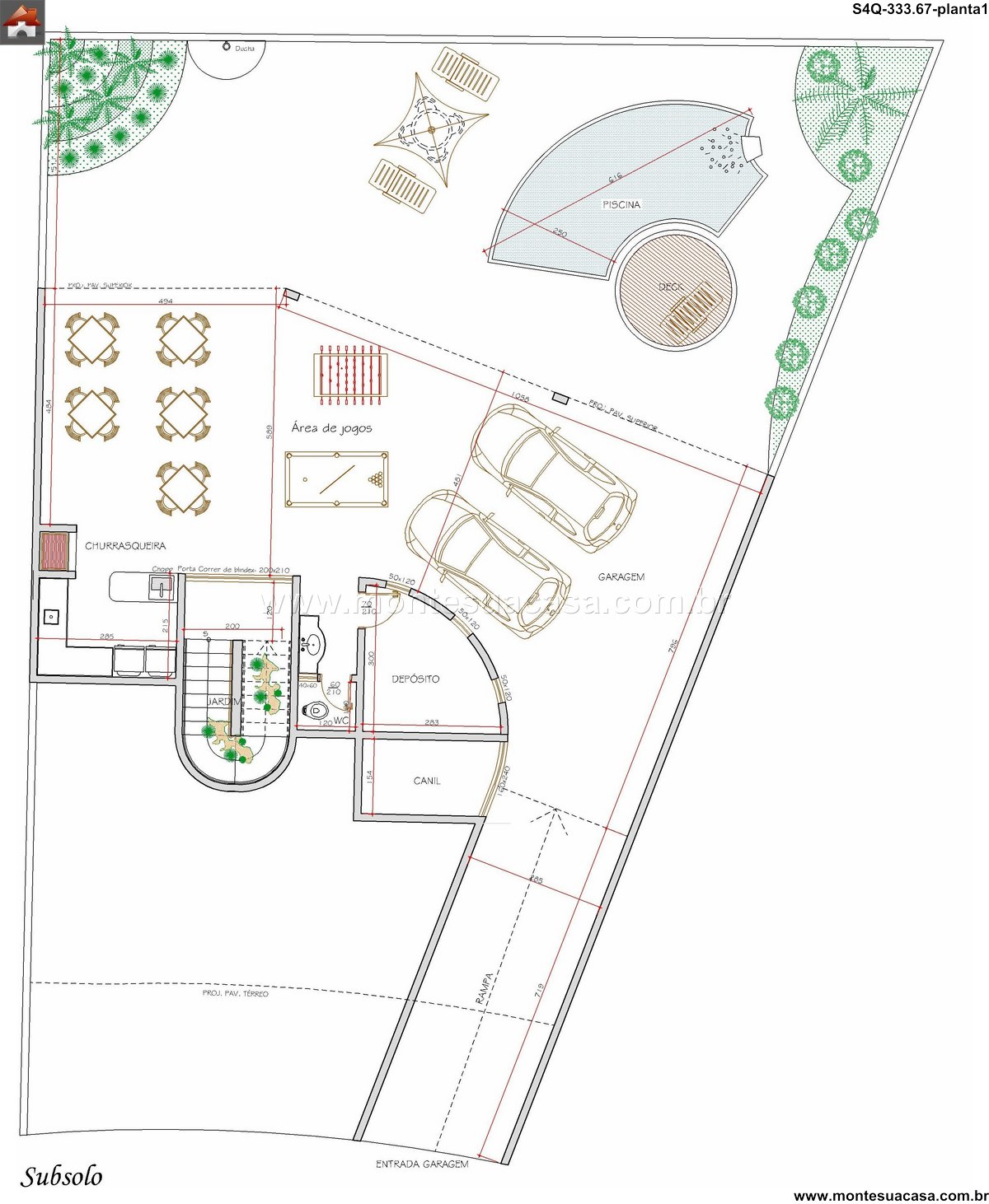 Os quatro quartos distribuem-se de forma estratégica, incluindo a Suíte Master com closet generoso. As dimensões de 250 x 210 garantem um espaço de descanso amplo e confortável. Os banheiros sociais e de apoio atendem convenientemente todos os setores da residência. A Garagem aproveita o desnível para acesso facilitado, enquanto o Depósito oferece armazenamento prático. A planta organiza os ambientes de serviço de forma eficiente, otimizando a rotina doméstica diária.
