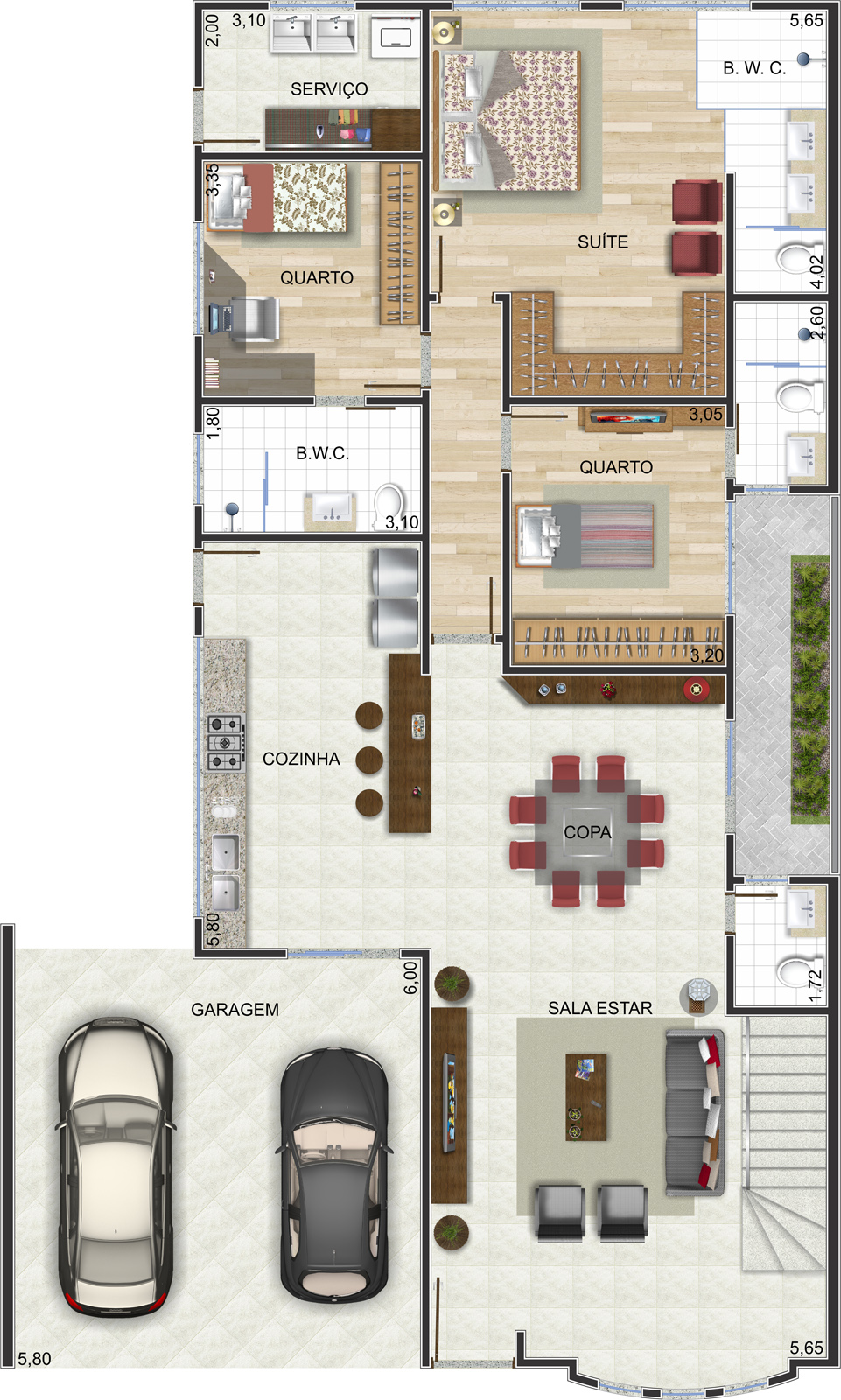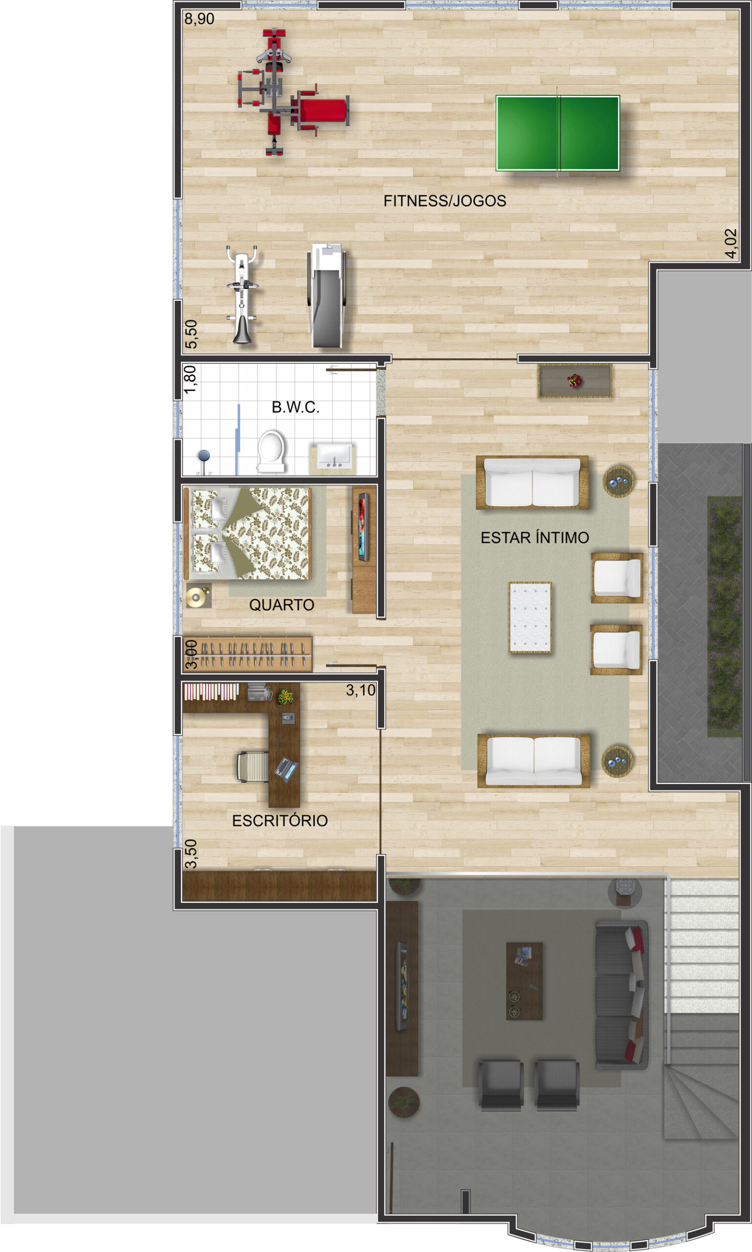 Lazer e funcionalidade O destaque do pavimento superior é a ampla sala de jogos e fitness, equipada para atividades físicas e momentos de descontração. A presença de um banheiro completo neste andar reforça a funcionalidade do espaço. A garagem coberta para dois veículos garante segurança e comodidade, enquanto o jardim frontal complementa o paisagismo com charme e frescor.