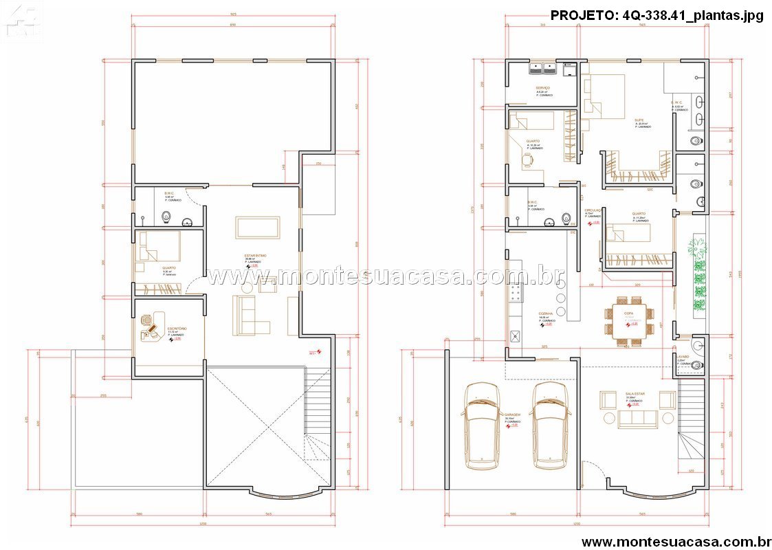 Setor íntimo e privacidade A planta contempla três quartos, incluindo uma suíte espaçosa com closet e banheiro privativo. Os demais quartos oferecem conforto e versatilidade, ideais para filhos, hóspedes ou até mesmo um home office. No pavimento superior, há uma sala íntima que pode ser adaptada como espaço de leitura ou TV, além de um escritório reservado para atividades profissionais ou estudos.
