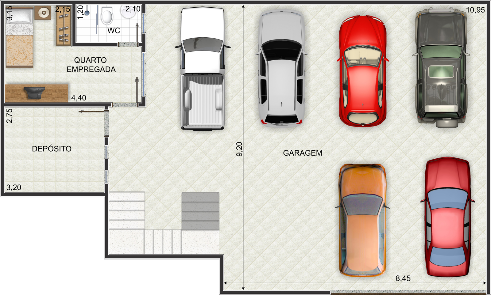 Um diferencial notável deste projeto é a garagem dupla e ampla, com medidas generosas que acomodam veículos com conforto. A área de serviço é completa e funcional, com fácil acesso à cozinha e à área externa. Um depósito espaçoso oferece solução prática para o armazenamento de itens sazonais. O projeto inclui ainda um quarto de empregada com banheiro próprio, assegurando independência. Este conjunto forma um bloco de serviço autossuficiente e extremamente organizado.
