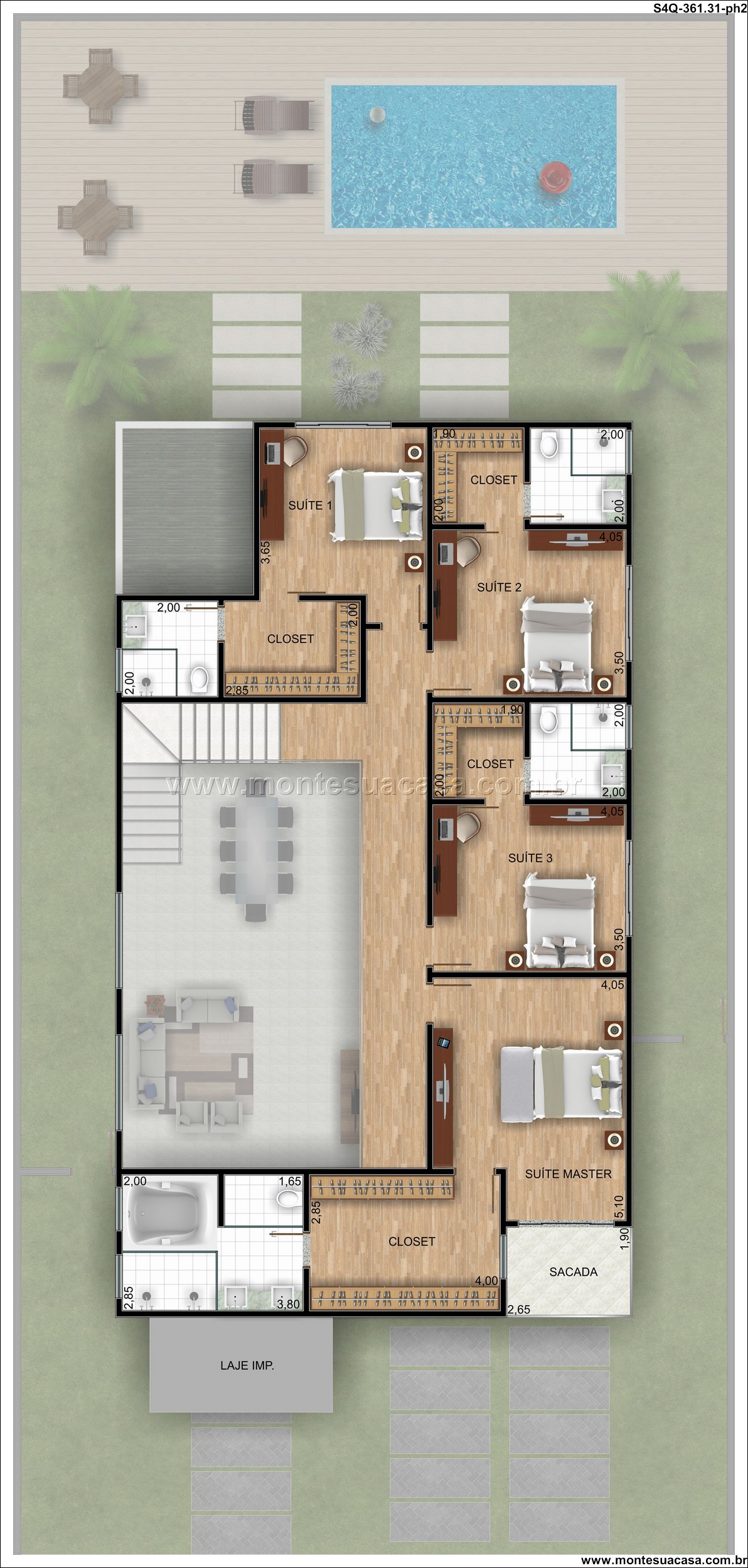 O pavimento superior abriga toda a área íntima, composta por quatro suítes que garantem absoluta privacidade e conforto. A suite master se destaca com seu closet exclusivo e uma sacada privativa, um refúgio pessoal para os moradores. As demais suítes também contam com closets, assegurando organização e praticidade para todos. Este andar é um verdadeiro santuário de descanso, projetado para recarregar as energias após um longo dia. A circulação bem resolvida conecta os quartos de forma eficiente.