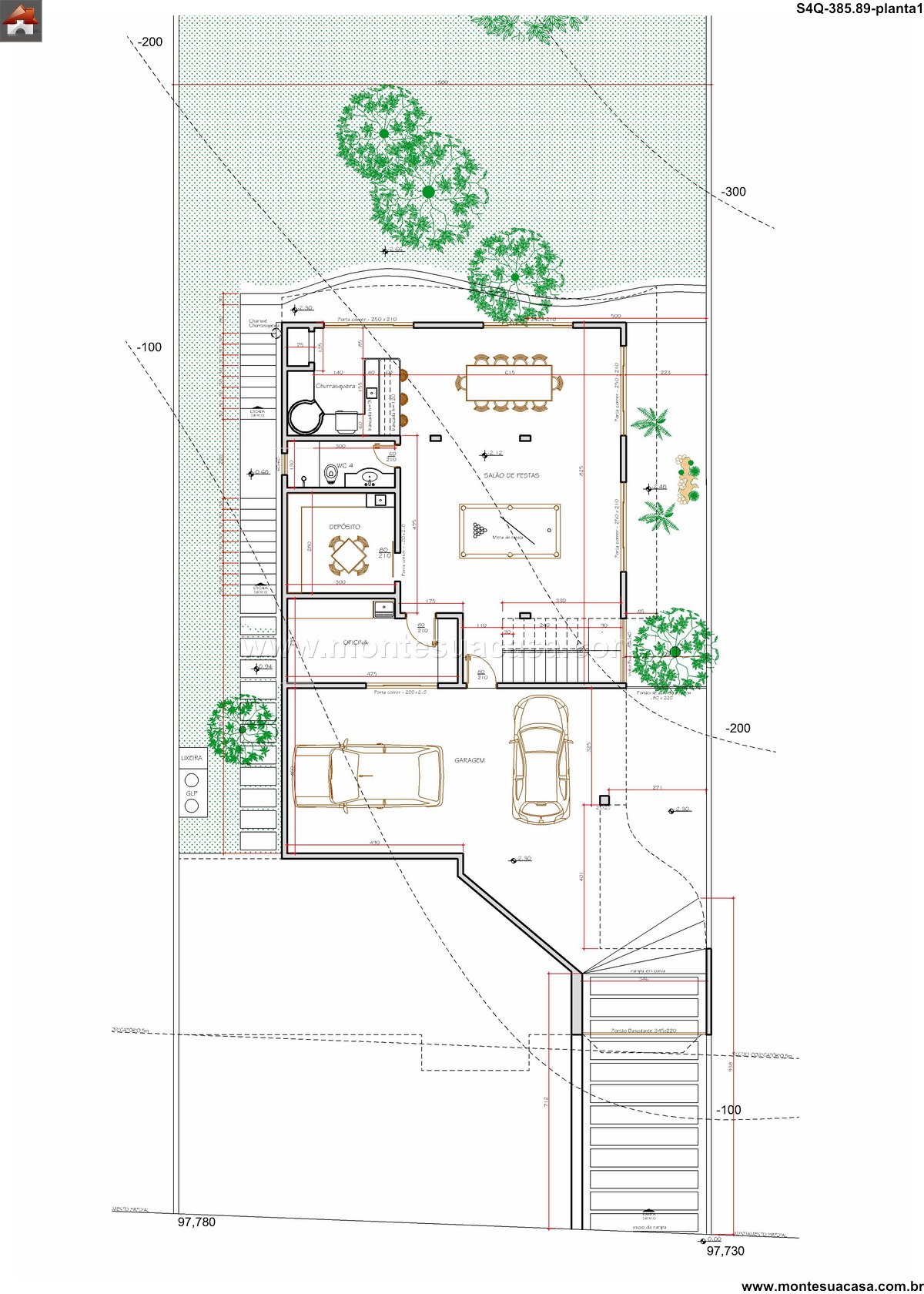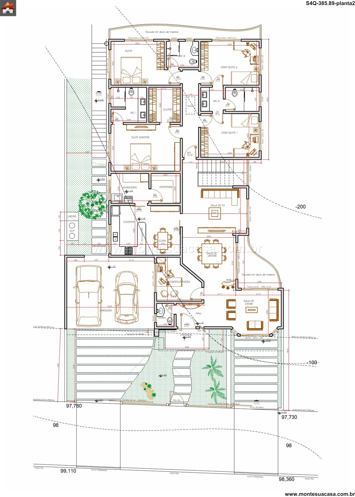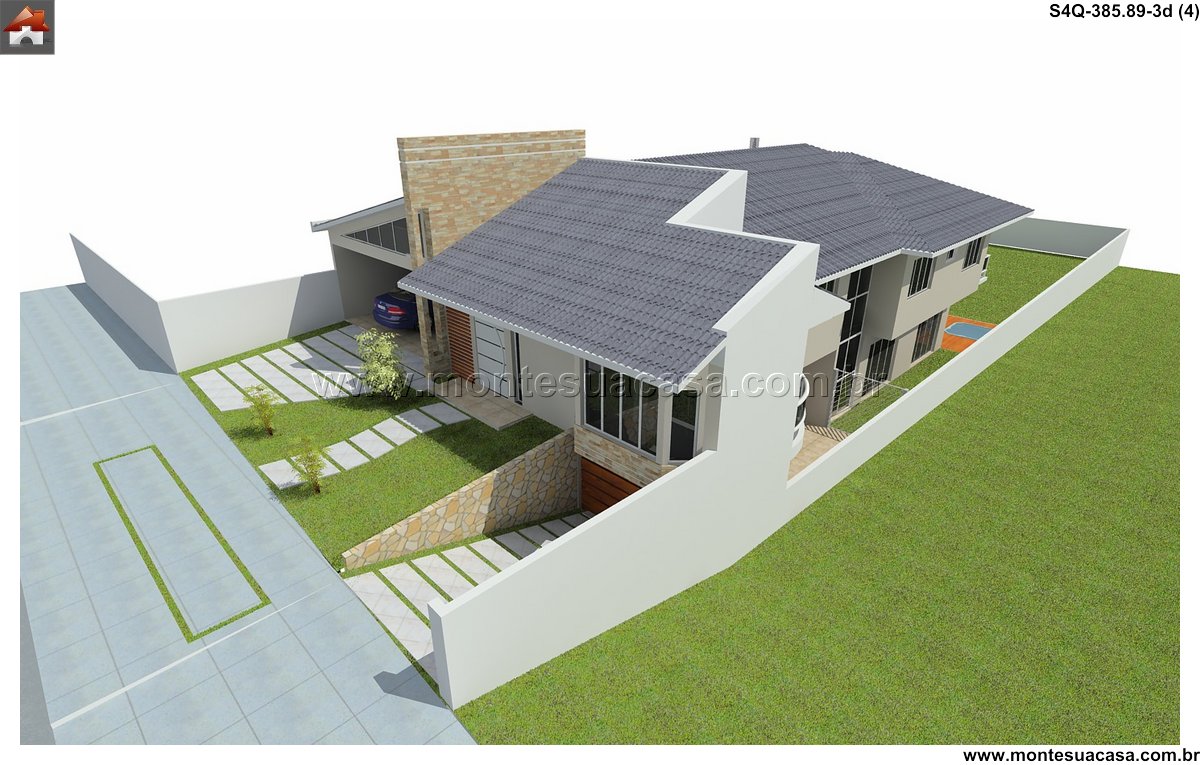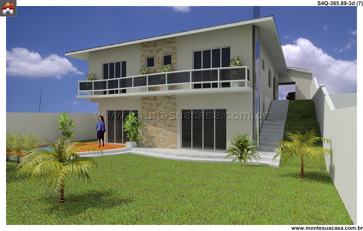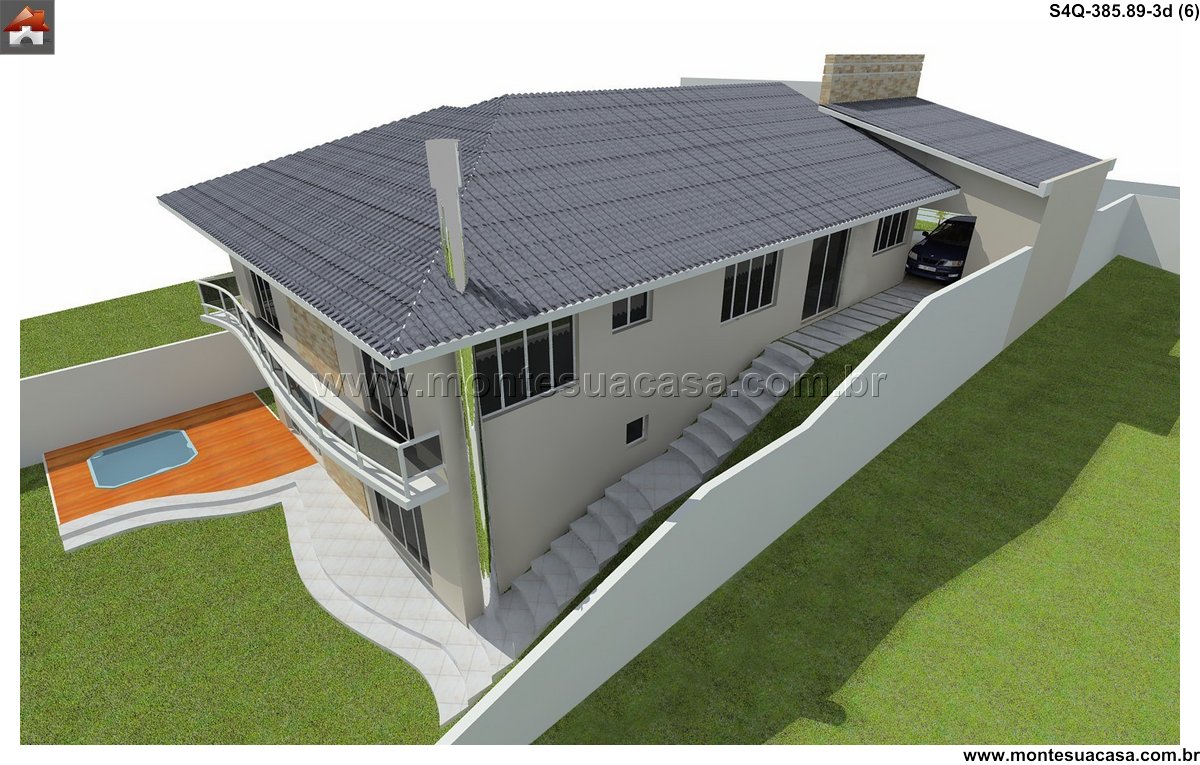 Este sobrado contemporâneo de 385.89m² foi inteligentemente concebido para se adaptar perfeitamente a um terreno em declive. A arquitetura aproveita a topografia natural para criar volumes dinâmicos e espaços diferenciados. O projeto não luta contra o terreno, mas dialoga com ele, resultando em uma residência única e integrada à paisagem. A solução garante privacidade e vistas privilegiadas para todos os ambientes.