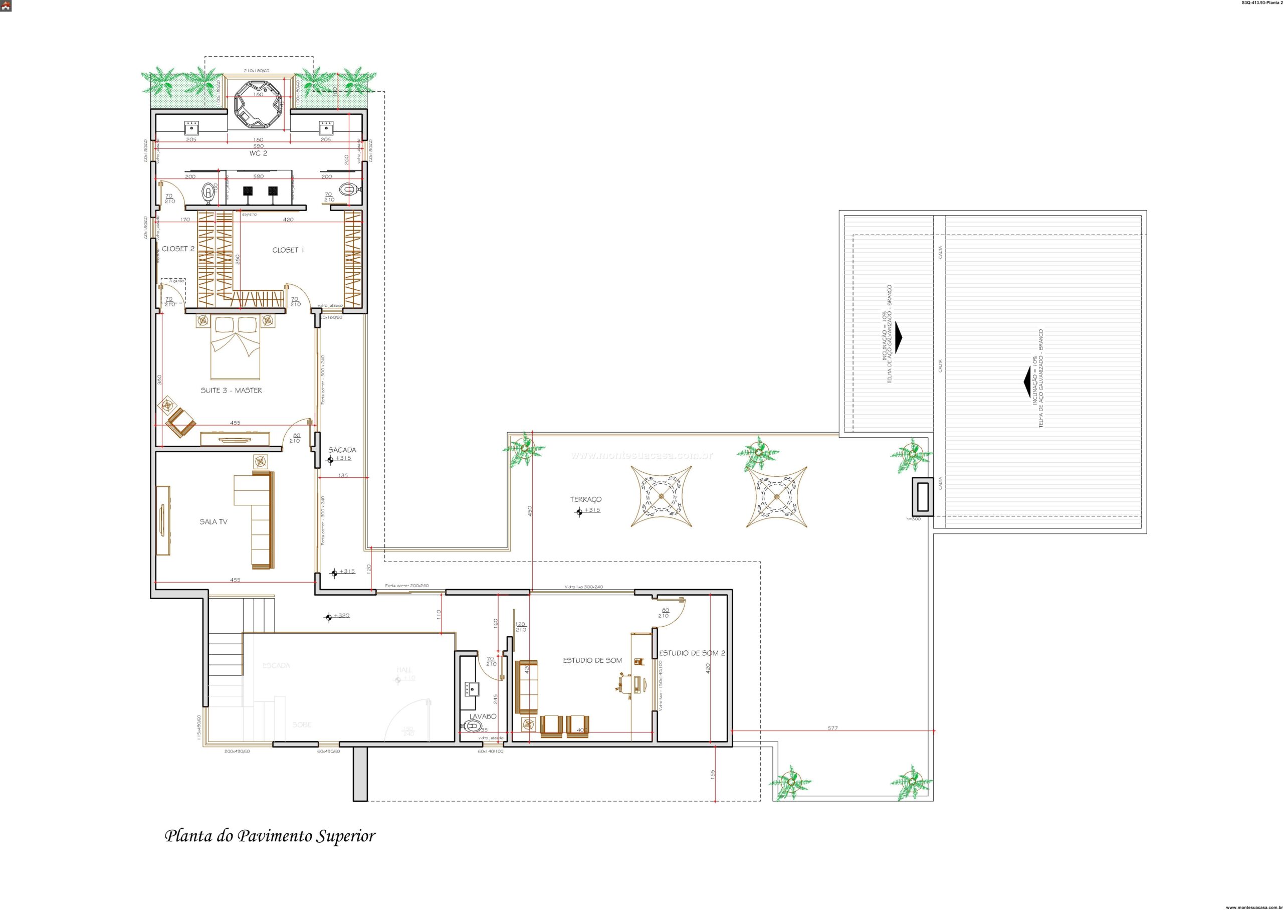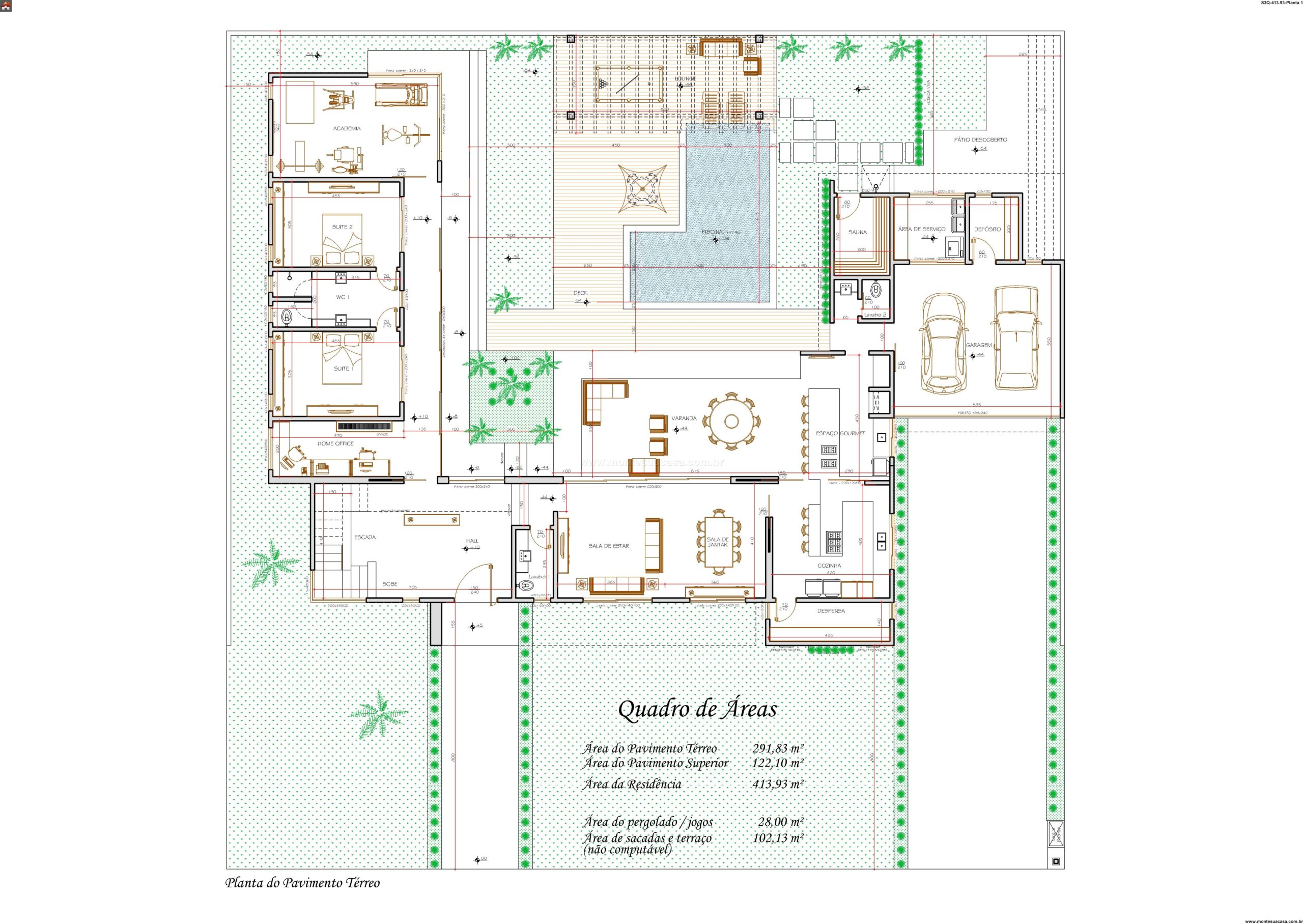 A planta organiza-se em sectores distintos que se complementam perfeitamente. A área residencial principal ocupa 413.93m², enquanto os espaços especializados somam 293.81m² para as áreas privativas e 122.10m² para os ambientes de lazer. Esta divisão estratégica garante privacidade quando necessário e integração quando desejada. O projeto inclui ainda 58.00m² dedicados a actividades específicas e 102.13m² para espaços de convívio e entretenimento.