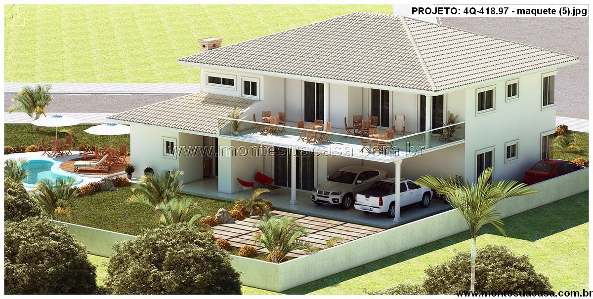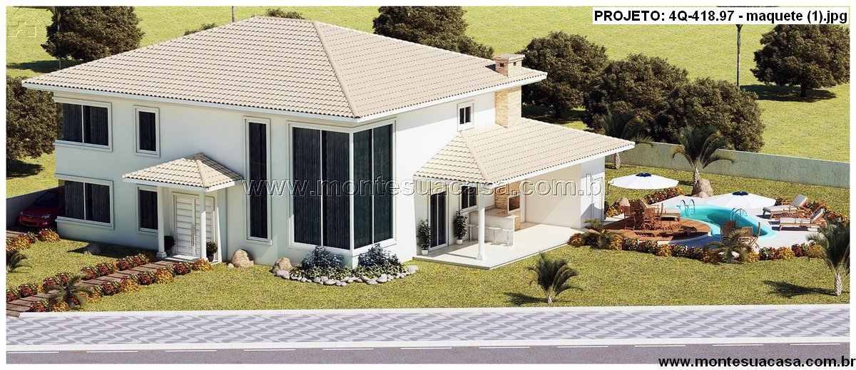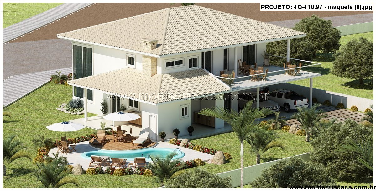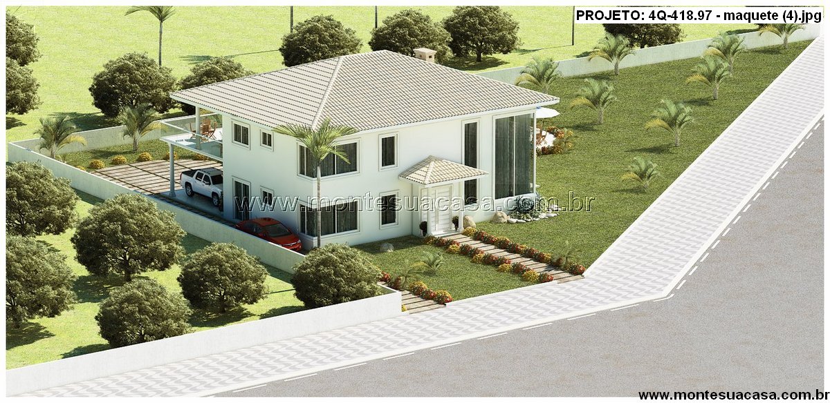 Cada detalhe deste projeto de 418.97m² pode ser personalizado para atender aos desejos específicos de cada cliente. A iluminação em LED e a automação residencial podem ser incorporadas para aumentar o conforto e a praticidade. A garagem acomoda múltiplas vagas, com espaço adicional para guardar equipamentos. Este é mais que uma simples casa; é um lar moderno e acolhedor, pronto para proporcionar uma experiência única de moradia com um layout que prioriza o bem-estar de todos os moradores.