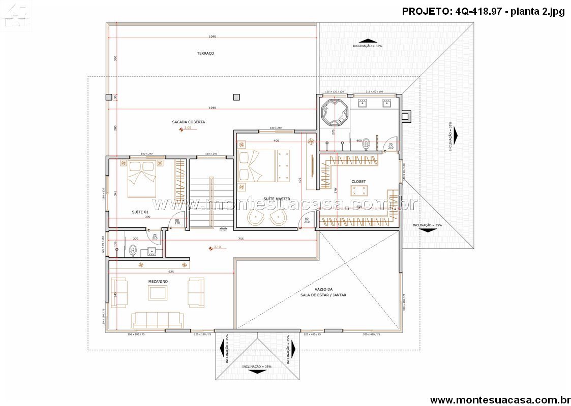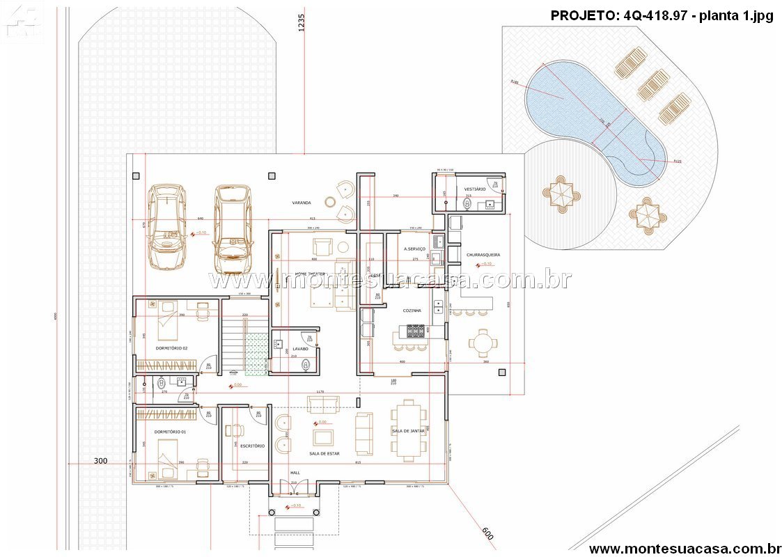 A área interna de 418.97m² está organizada em quatro quartos espaçosos, sendo uma suíte master com amplo closet. Os banheiros sociais e privativos seguem um padrão de excelência, com revestimentos de primeira linha e metais sanitários que conferem um toque de luxo. A cozinha, integrada à área gourmet e à sala de jantar, forma o coração da casa, perfeita para receber amigos e familiares. Um home office ou quarto de hóspedes complementa a planta, adicionando versatilidade ao dia a dia.