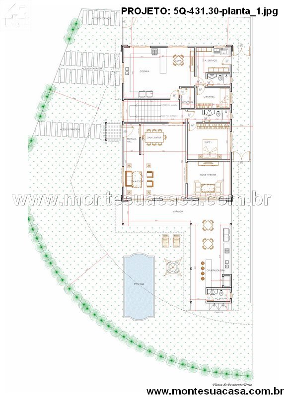 Ainda no térreo, a suíte de hóspedes atende famílias que recebem visitas com frequência ou que precisam de um dormitório no mesmo nível da área social. Essa solução aumenta o conforto e reduz deslocamentos, especialmente para idosos. O home theater amplia a oferta de espaços internos, funcionando como sala alternativa para momentos mais reservados.