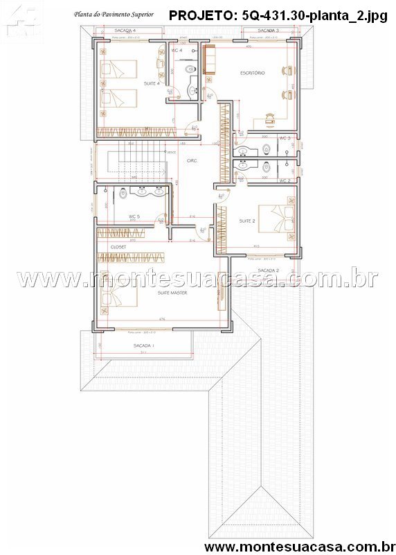 O pavimento superior organiza quatro suítes adicionais, incluindo a suíte master, que dispõe de closet amplo e sacada privativa. A presença de um escritório integrado ao pavimento reforça o caráter funcional do projeto, permitindo trabalho e estudo com privacidade. As sacadas distribuídas criam ventilação cruzada, iluminam os ambientes e ampliam a sensação de abertura.