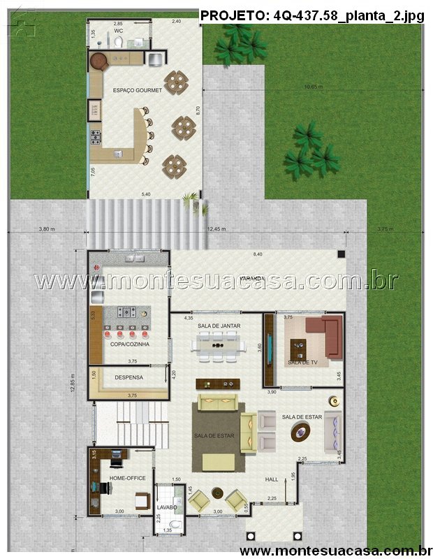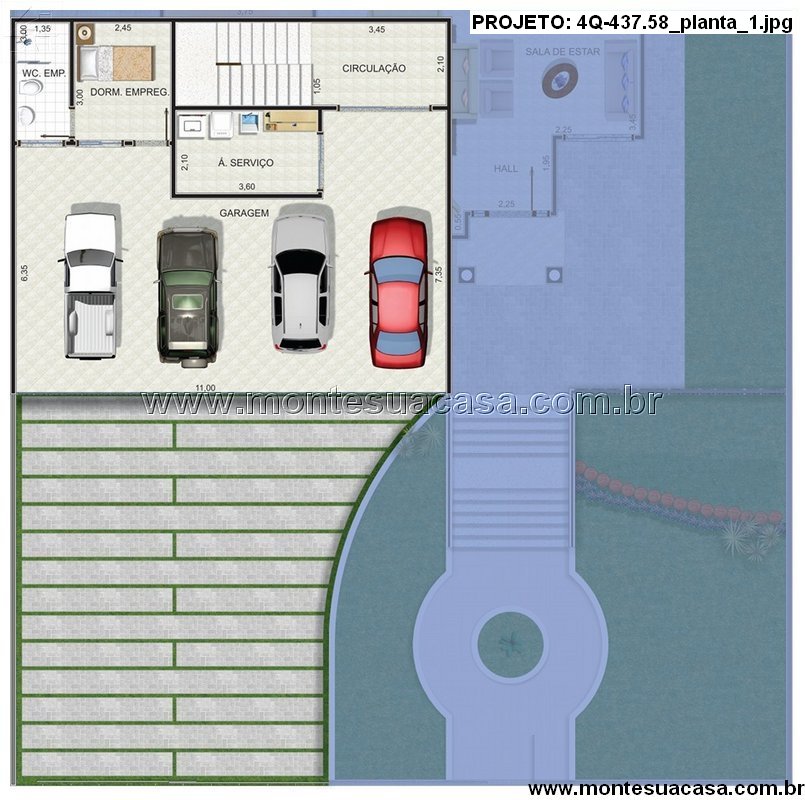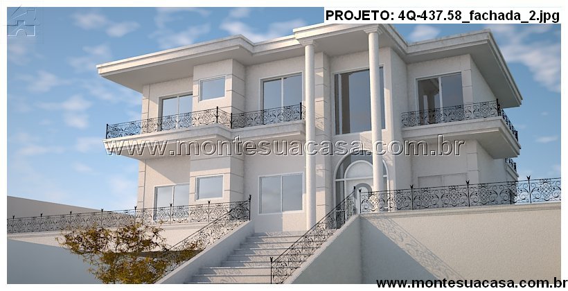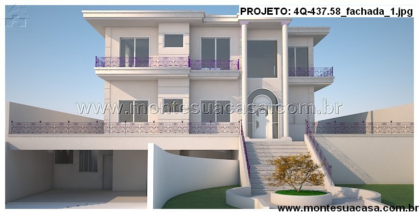 Explore este sofisticado projeto de 437.58m2, uma residência familiar que harmoniza o requinte contemporâneo com a funcionalidade prática. A planta é meticulosamente planejada para oferecer conforto superior e uma experiência de moradia fluida e integrada. A fachada, apresentada em quatro vistas distintas, estabelece uma identidade arquitetônica marcante e convidativa, prenunciando a qualidade dos espaços internos.