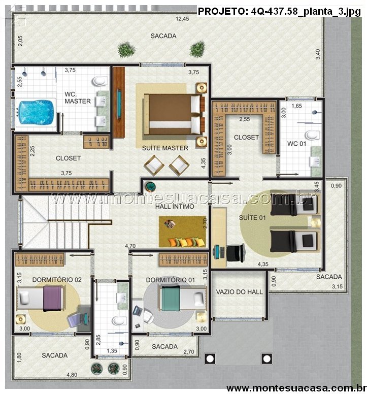 O pavimento superior abriga a zona íntima, garantindo total privacidade. A Suite Master é um refúgio de luxo, com closet generoso de 3.75m e banheiro privativo. Dois outros dormitórios, Dormitório 01 e 02, cada um com sua sacada, compartilham o WC 01, assegurando conforto a todos os residentes. Um closet adicional de 3.00m complementa este andar, oferecendo amplo armazenamento. A circulação é inteligente, conectando os quartos às áreas de convívio externo através das sacadas.