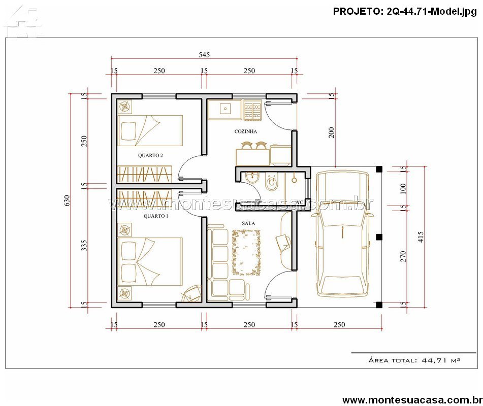 Este projeto de casa térrea com 2 quartos e garagem apresenta uma solução inteligente e funcional para quem busca conforto, praticidade e ótimo aproveitamento de espaço em um terreno compacto. Com área total de 44,71 m², o layout foi cuidadosamente desenvolvido para oferecer ambientes integrados e bem ventilados, ideais para famílias pequenas, casais ou pessoas que desejam investir em um imóvel econômico e aconchegante.