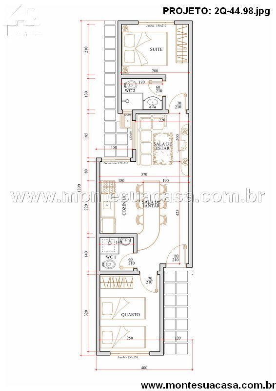 O projeto de casa térrea com 44,98m² foi desenvolvido para quem busca praticidade, conforto e excelente aproveitamento de espaço em um terreno estreito. Com dois dormitórios — sendo um deles uma suíte aconchegante —, esta casa oferece uma distribuição inteligente dos ambientes, ideal para famílias pequenas ou casais que desejam um lar funcional e acolhedor.