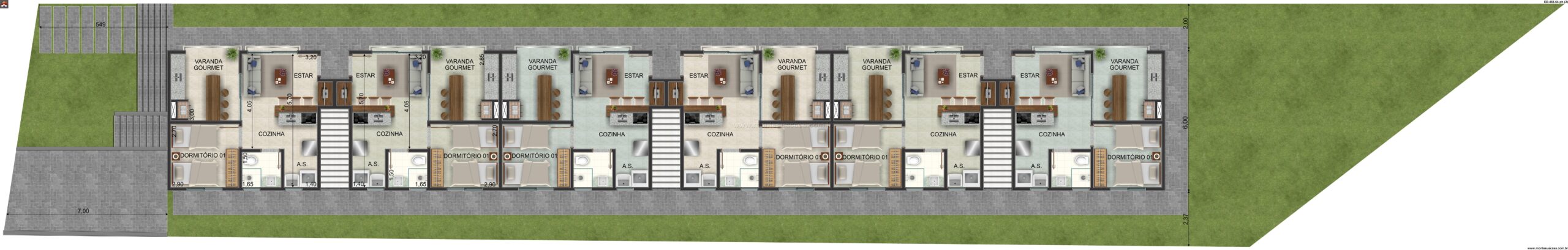 Localizadas no pavimento térreo, as unidades de um quarto são um exemplo de otimização de espaço. Elas integram perfeitamente a sala de estar com a cozinha, que conta com um prático balcão americano. Esta configuração promove um ambiente social amplo e aconchegante. A área de serviço separada assegura a organização do dia a dia. A varanda gourmet anexa estende a área de convívio, oferecendo um espaço perfeito para refeições informais ou momentos de descontração.