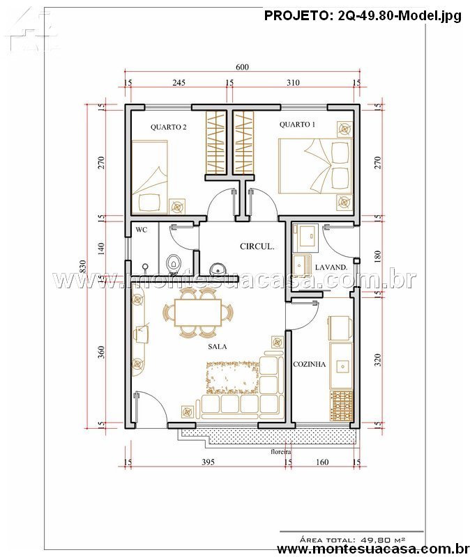 Este projeto de casa térrea com 2 quartos e 49,80m² é a opção ideal para quem busca praticidade, conforto e excelente aproveitamento de espaço. Com um layout inteligente, a planta valoriza cada metro quadrado, oferecendo ambientes integrados e funcionais para o dia a dia da família.