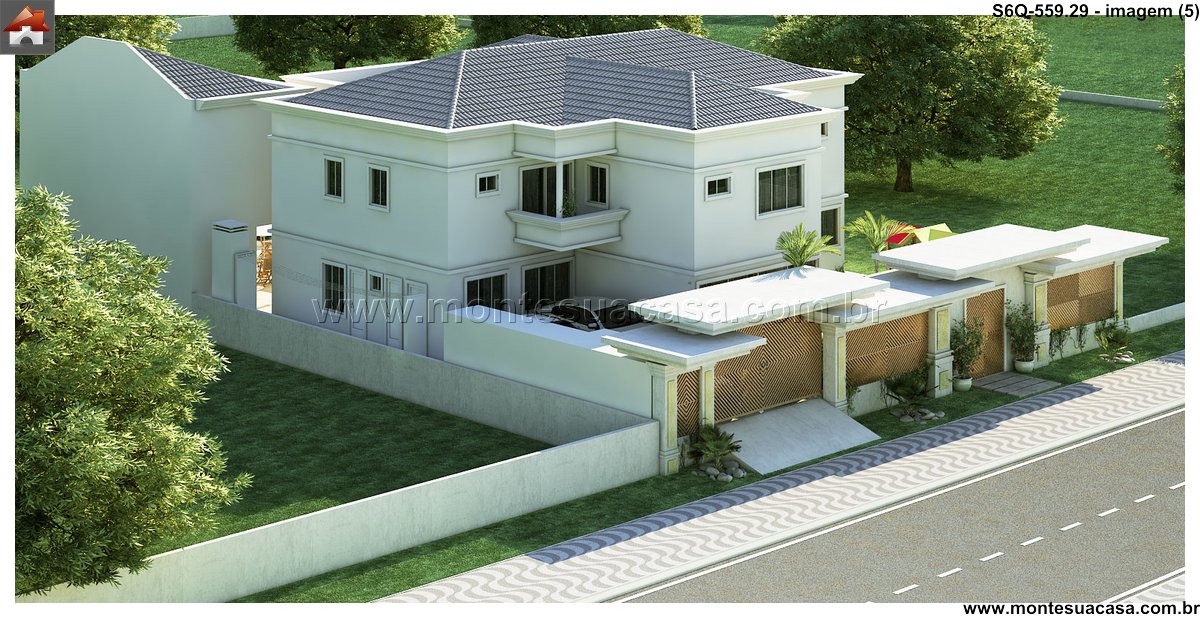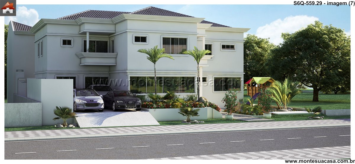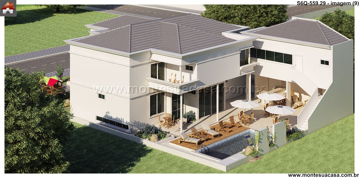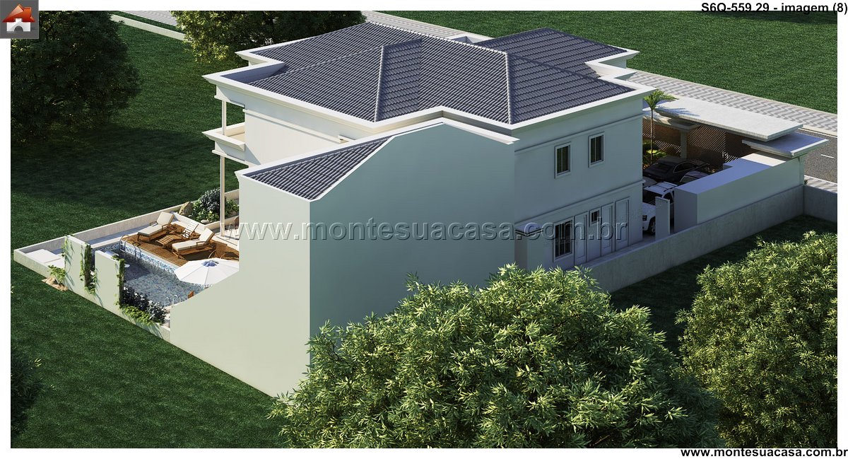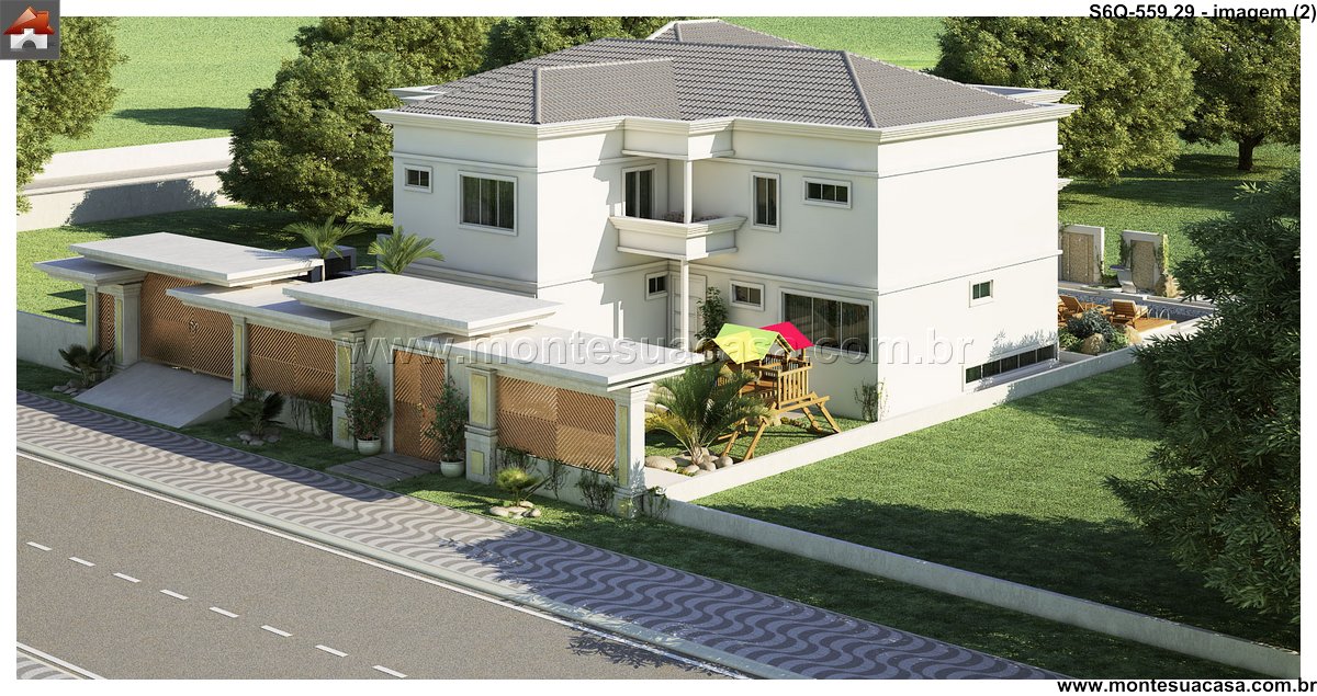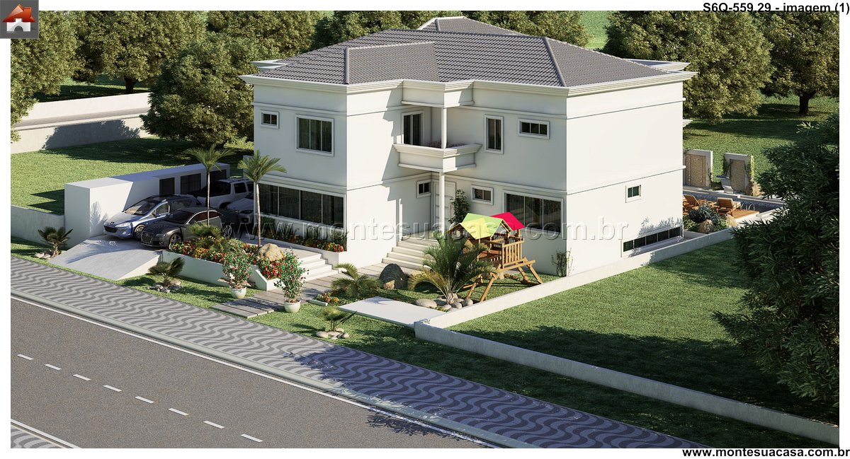 Este sofisticado projeto de sobrado desenvolve-se harmonicamente em três pavimentos totalizando 559.29m² de área construída. A residência foi meticulosamente planejada para oferecer conforto máximo e funcionalidade, distribuindo seis quartos entre os diferentes níveis. No pavimento térreo, destacam-se os ambientes sociais integrados, incluindo sala de estar, sala de jantar, cozinha gourmet com despensa, lavanderia prática e uma espaçosa brinquedoteca. A área gourmet conta com bar próprio, perfeito para entretenimento e reuniões familiares.
