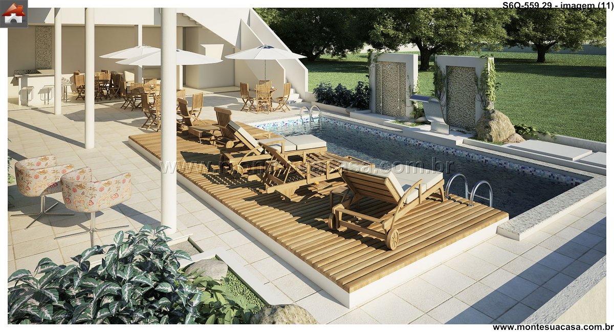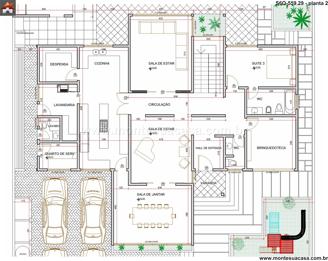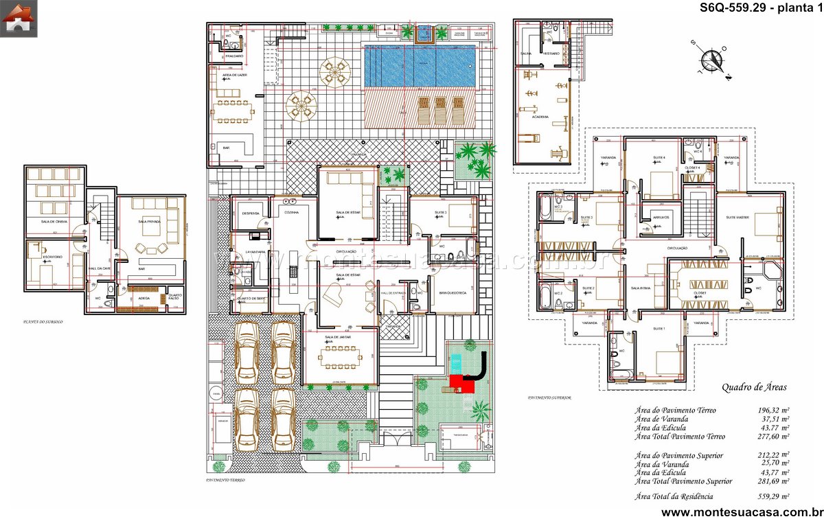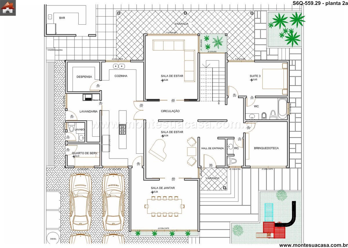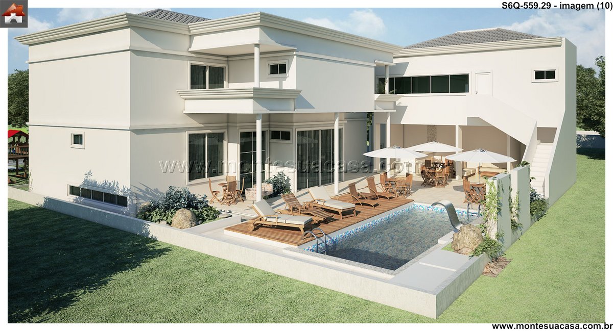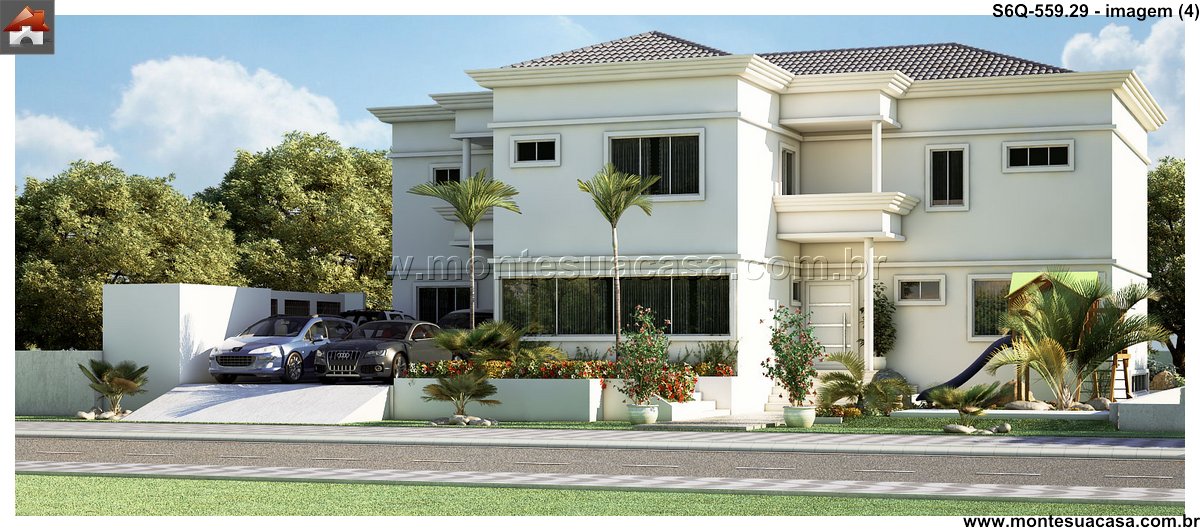 Este sofisticado projeto de sobrado desenvolve-se harmonicamente em três pavimentos totalizando 559.29m² de área construída. A residência foi meticulosamente planejada para oferecer conforto máximo e funcionalidade, distribuindo seis quartos entre os diferentes níveis. No pavimento térreo, destacam-se os ambientes sociais integrados, incluindo sala de estar, sala de jantar, cozinha gourmet com despensa, lavanderia prática e uma espaçosa brinquedoteca. A área gourmet conta com bar próprio, perfeito para entretenimento e reuniões familiares.