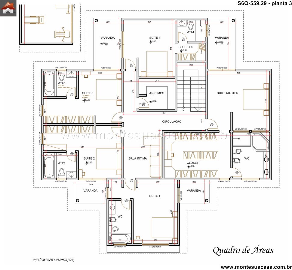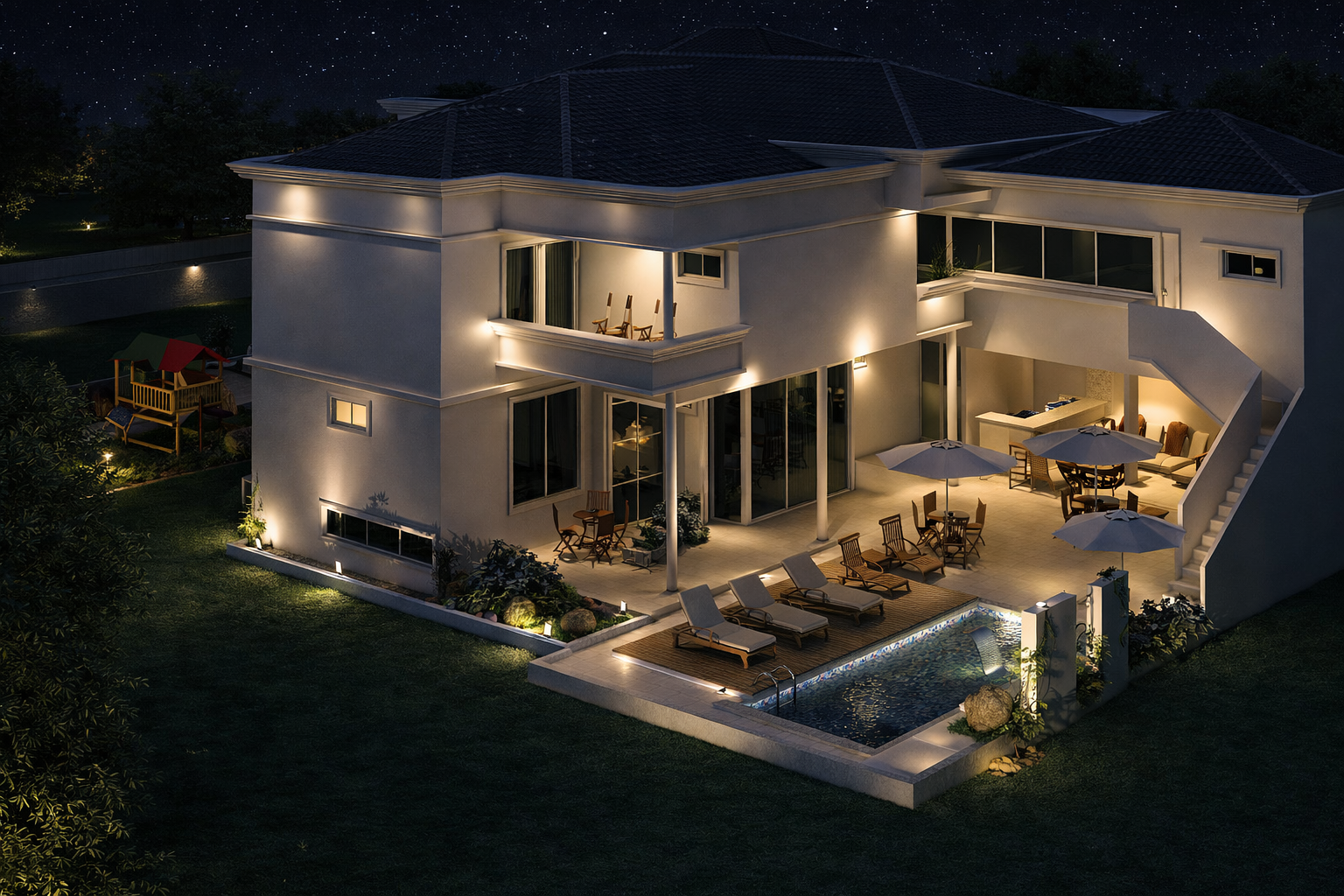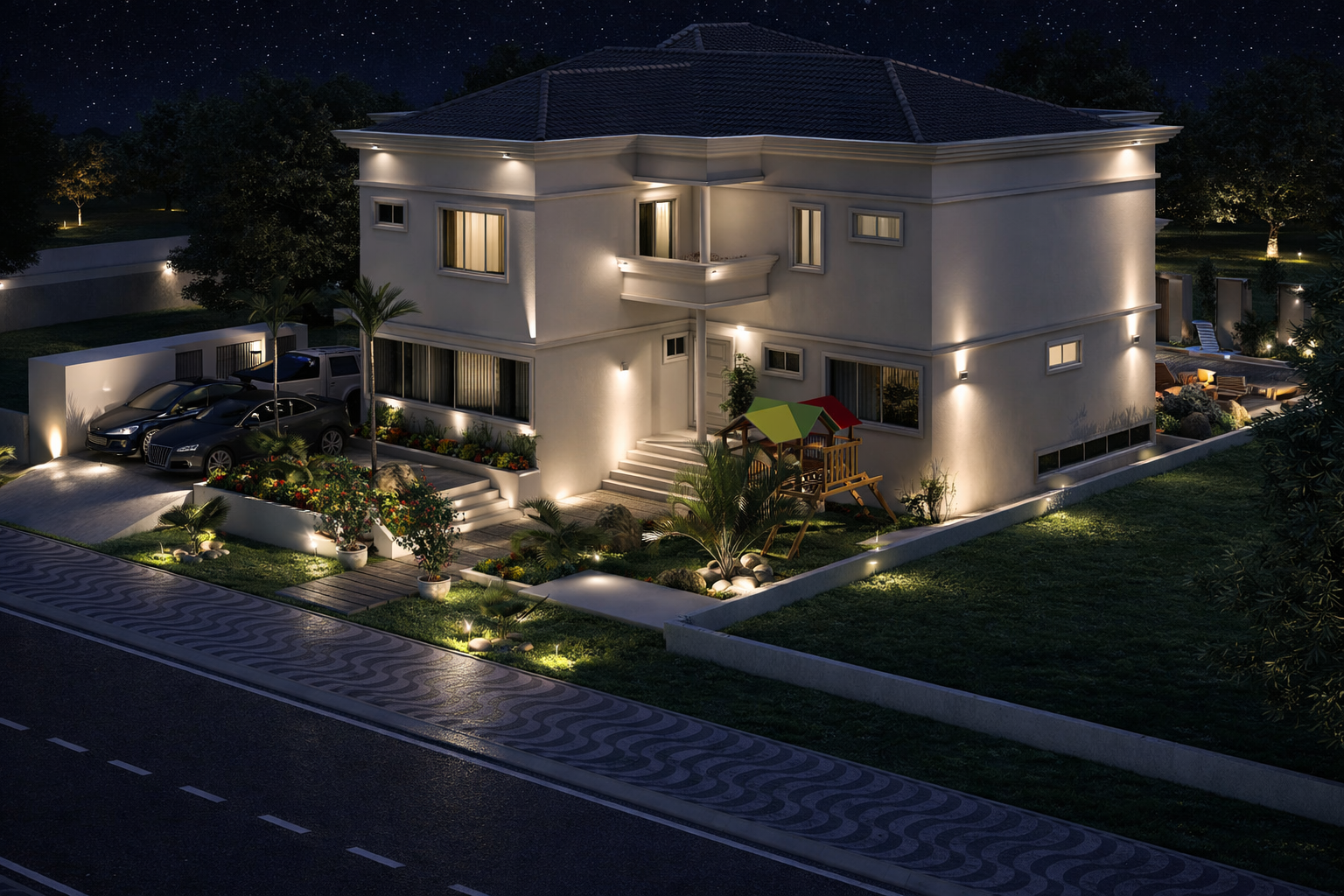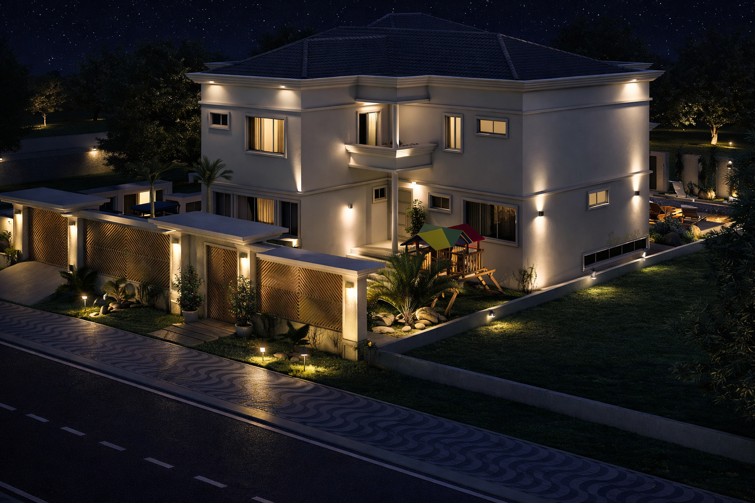Este sofisticado projeto de sobrado desenvolve-se harmonicamente em três pavimentos totalizando 559.29m² de área construída. A residência foi meticulosamente planejada para oferecer conforto máximo e funcionalidade, distribuindo seis quartos entre os diferentes níveis. No pavimento térreo, destacam-se os ambientes sociais integrados, incluindo sala de estar, sala de jantar, cozinha gourmet com despensa, lavanderia prática e uma espaçosa brinquedoteca. A área gourmet conta com bar próprio, perfeito para entretenimento e reuniões familiares.