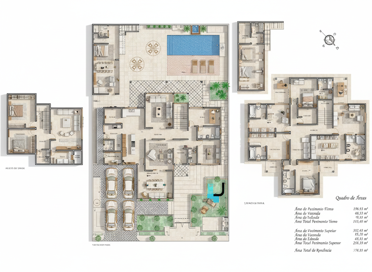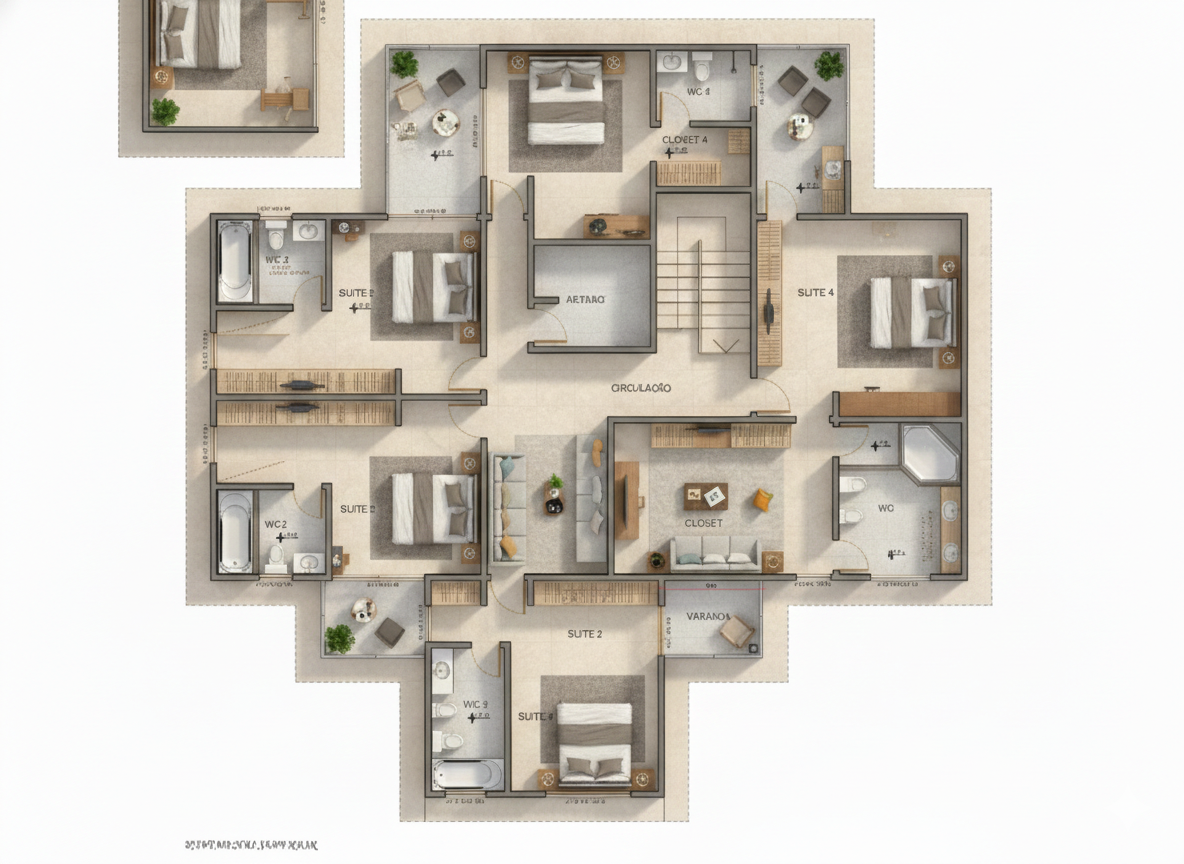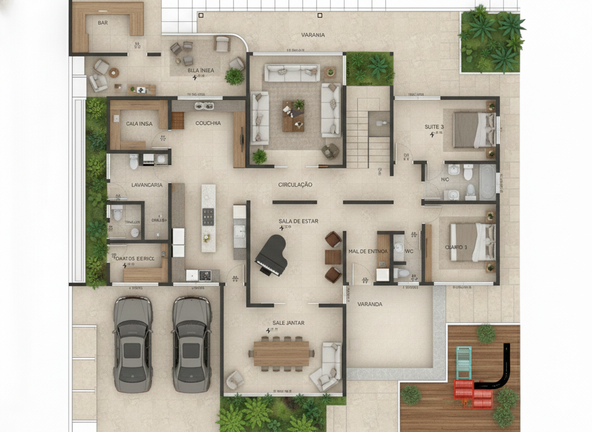A circulação inteligente conecta todos os ambientes de forma fluida, garantindo praticidade no dia a dia. Os espaços foram pensados para atender às necessidades de uma família moderna, com ênfase na integração entre áreas comuns e privativas. A localização estratégica da suíte master garante isolamento acústico e visual, enquanto as varandas amplas permitem múltiplas possibilidades de uso, desde jardins suspensos até áreas de lounge ao ar livre.
