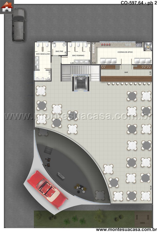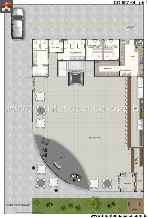 A experiência do cliente começa no momento em que ele cruza a entrada, projetada para criar impacto imediato. O fluxo de circulação foi minuciosamente estudado para evitar congestionamentos e garantir movimento fluido entre as diferentes zonas. A área principal de dança se destaca como o coração pulsante do clube, com um sistema de iluminação e som de última geração. Ambientes secundários, como lounges e áreas VIP, oferecem refúgios mais intimistas sem desconectar da energia do local. O projeto também integra um eficiente acesso de carga e descarga, fundamental para a operação logística do estabelecimento. Este planejamento garante que a equipe possa trabalhar nos bastidores sem interferir na experiência de lazer.