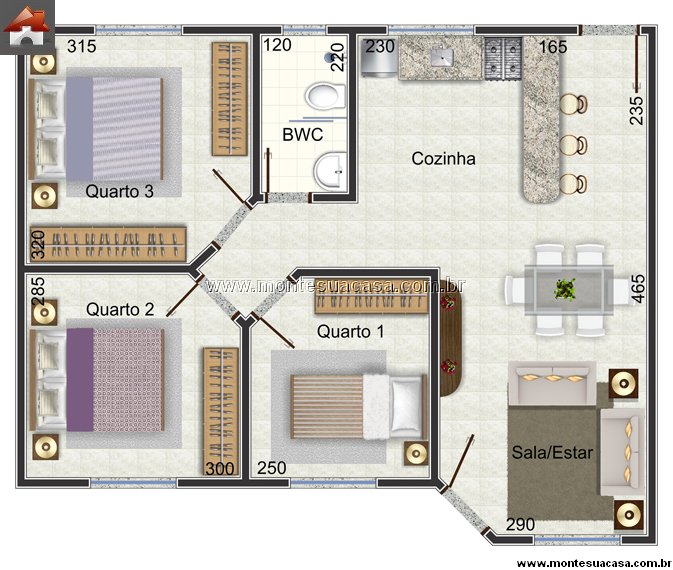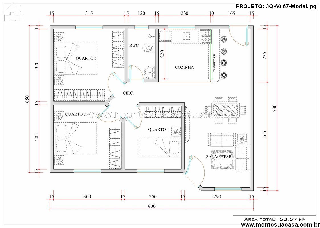 Com sua estrutura compacta e bem distribuída, o projeto 3Q-60,67 se adapta a diferentes terrenos, mantendo um equilíbrio entre custo acessível e conforto. É uma excelente opção para quem deseja construir uma casa térrea prática, elegante e funcional.