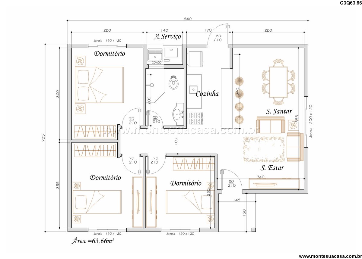 A área social se destaca pela integração entre a sala de estar e a sala de jantar, formando um ambiente espaçoso ideal para convívio familiar e entretenimento. A cozinha, conectada à área de serviço, oferece praticidade para as refeições e atividades domésticas diárias. Os três dormitórios garantem privacidade e conforto para todos os moradores, com armários embutidos proporcionando organização. Os banheiros atendem perfeitamente às necessidades da família, complementando esta casa que valoriza o bem-estar e a qualidade de vida.
