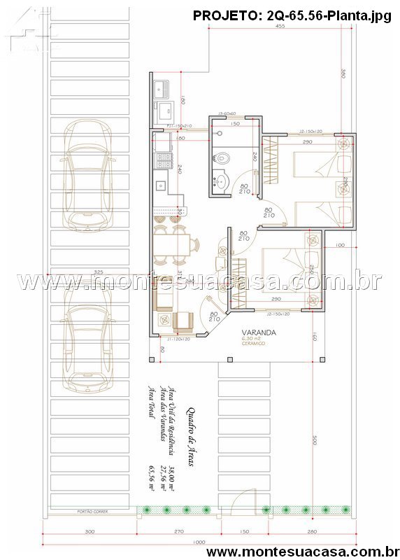 Com 65,56m² de área total, o projeto foi desenvolvido para aproveitar cada metro quadrado de forma eficiente. A planta apresenta dois dormitórios bem ventilados e iluminados, banheiro social, sala de estar integrada à sala de jantar e uma cozinha funcional. A integração entre os ambientes principais amplia o espaço e favorece a convivência familiar.