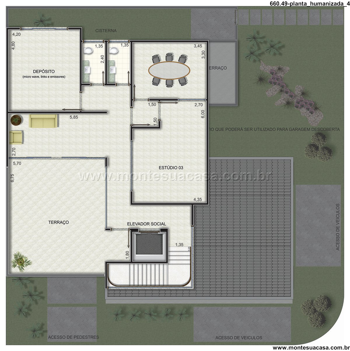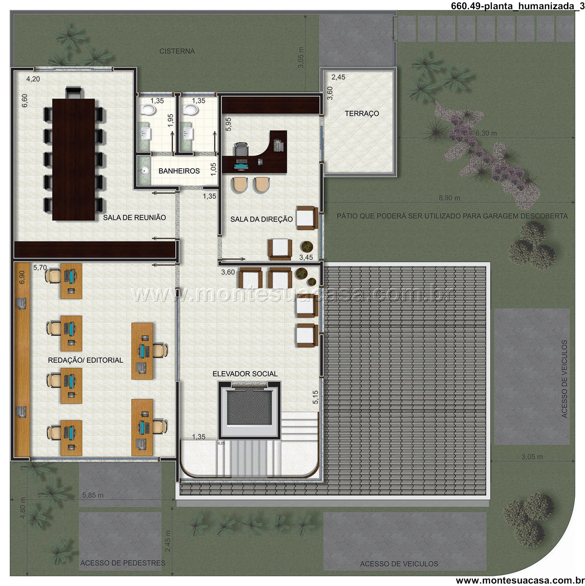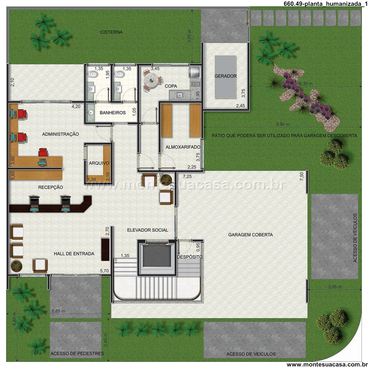 Distribuição inteligente dos ambientes No térreo, o projeto contempla áreas essenciais como recepção, hall de entrada, administração, copa, banheiros, almoxarifado, depósito e garagem coberta. Há também um pátio que pode ser utilizado como garagem descoberta, além de acessos distintos para pedestres e veículos, garantindo fluidez e segurança.