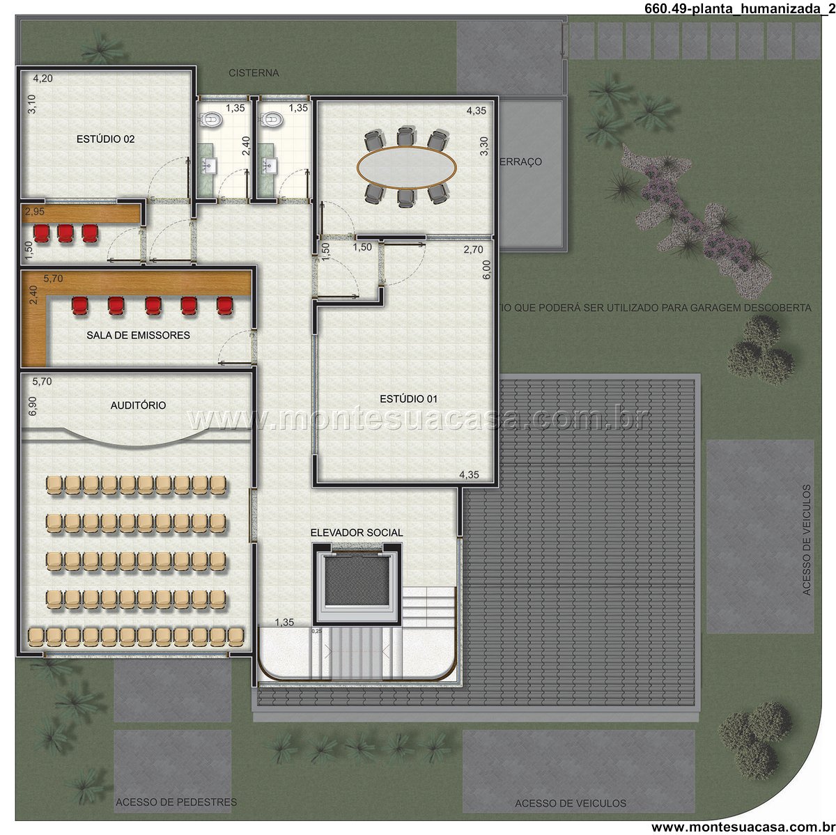 Espaços técnicos e de produção Nos pavimentos superiores, encontram-se os estúdios de gravação (Estúdio 01, 02 e 03), sala de emissores e áreas técnicas como gerador e cisterna. Cada estúdio foi dimensionado para proporcionar conforto acústico e funcionalidade, com mobiliário adequado e circulação eficiente. A sala de emissores, equipada com poltronas e infraestrutura técnica, permite controle preciso das transmissões.