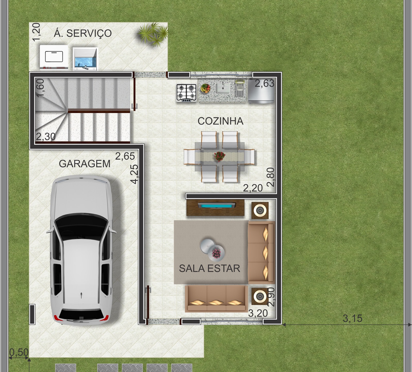 O pavimento inferior abriga a área social, integrando perfeitamente a sala de estar, com generosos 3.20m x 3.15m, e a cozinha. Essa configuração ampla é ideal para receber amigos e familiares, promovendo momentos de descontração. A cozinha, com seus 2.63m x 2.20m, possui fácil acesso à área de serviço, garantindo a praticidade nas tarefas domésticas. A garagem coberta complementa este piso, oferecendo comodidade e segurança para o veículo da família.