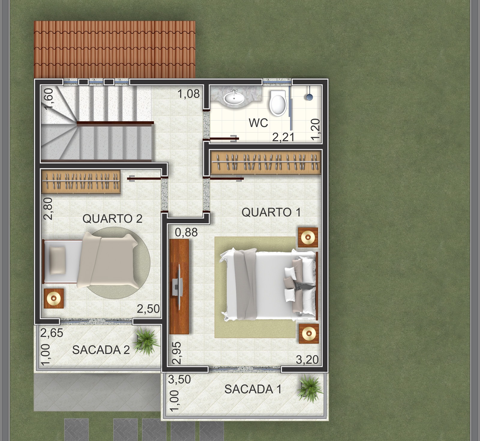 A ala privativa, localizada no pavimento superior, foi pensada para garantir sossego e intimidade. O projeto conta com dois quartos espaçosos, sendo que o Quarto 1 possui acesso direto à Sacada 1, ampliando seu ambiente e trazendo mais luminosidade. O Quarto 2, também de bom tamanho, oferece um refúgio igualmente aconchegante. Um banheiro social bem dimensionado atende a este piso, assegurando funcionalidade para os moradores. As sacadas superiores proporcionam áreas de extensão privativas.
