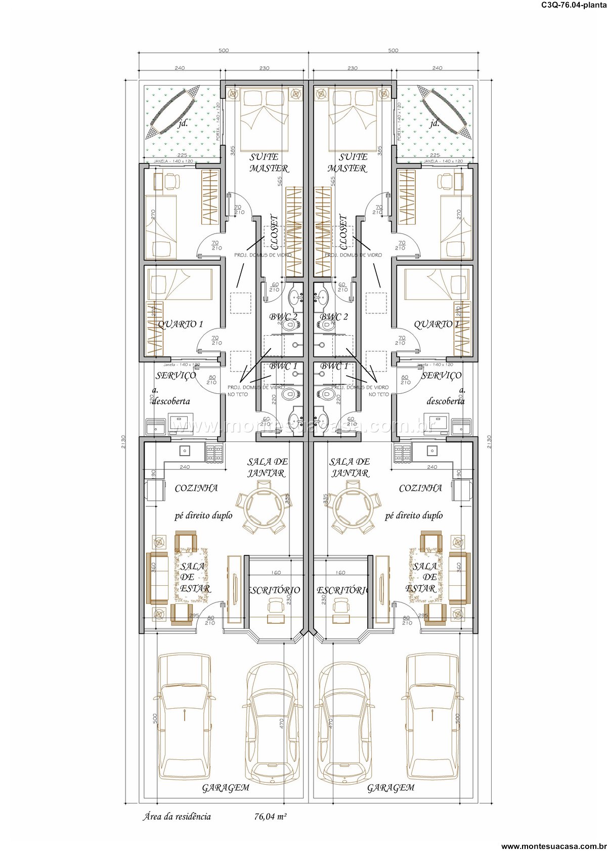 Este projeto de casa térnea de 76.04 m² foi meticulosamente planejado para oferecer conforto, privacidade e um estilo de vida moderno. A planta se destaca pela sua funcionalidade e pela sensação de amplitude, criando um ambiente perfeito para famílias. Cada metro quadrado foi otimizado para garantir praticidade no dia a dia sem abrir mão do aconchego. A circulação inteligente conecta os ambientes de forma harmoniosa, promovendo uma fluidez natural entre os espaços de convívio e os dormitórios. Este é o projeto ideal para quem busca uma residência completa e bem distribuída.