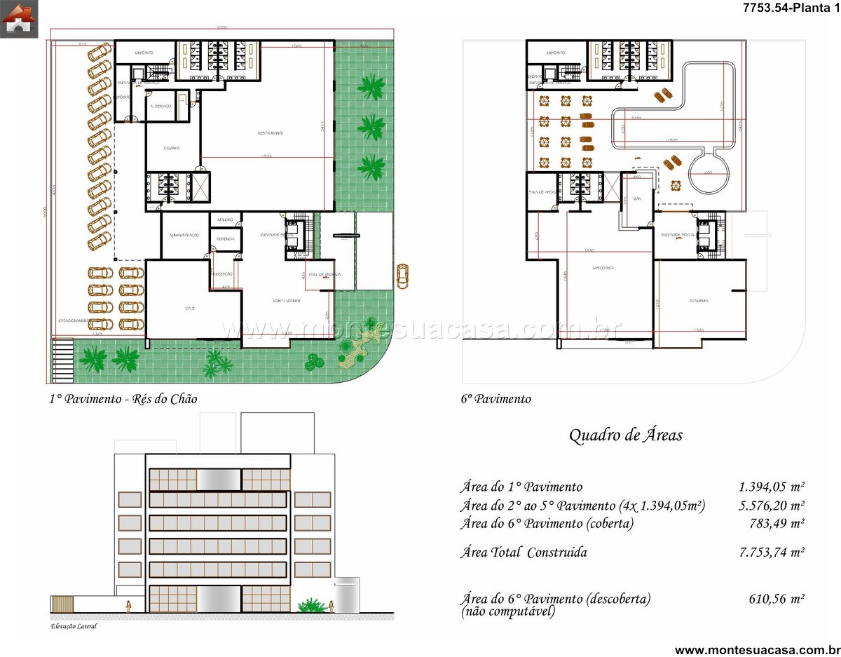 Distribuição inteligente das suítes Cada um dos quatro andares residenciais possui 1.394,05m², com 25 suítes bem distribuídas, garantindo privacidade, ventilação cruzada e iluminação natural. As unidades podem ser configuradas em diferentes tipologias, como suítes standard, luxo e premium, conforme o perfil do público-alvo. A presença de elevadores sociais e de serviço em todos os pavimentos assegura acessibilidade e eficiência operacional.