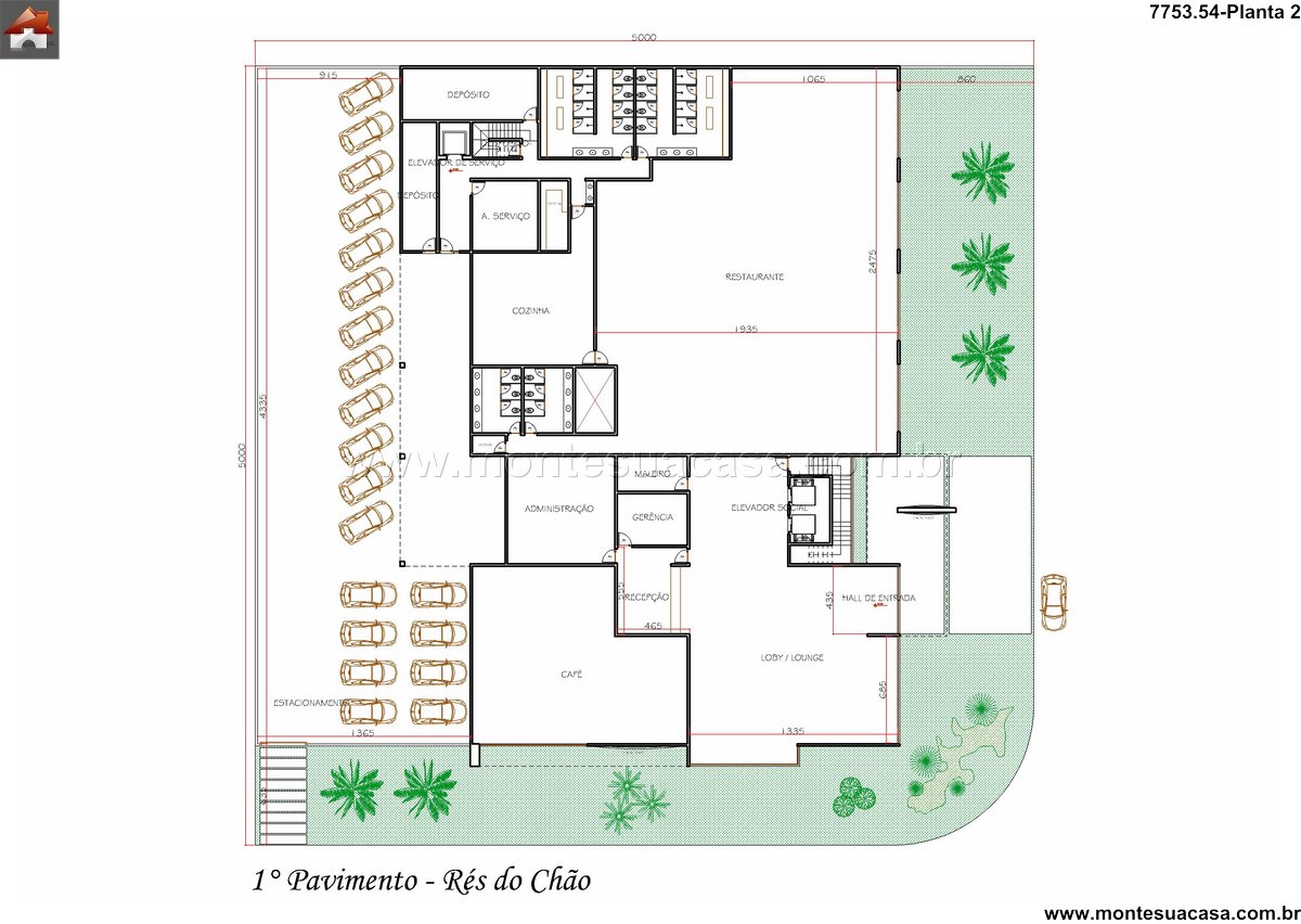 Pavimento térreo com áreas sociais e comerciais O primeiro pavimento abriga recepção, café, restaurante com cozinha industrial, lojas, administração, lounge e estacionamento. O restaurante, com mais de 470m², é ideal para atender hóspedes e visitantes externos, funcionando como ponto gastronômico estratégico. A área de recepção é ampla e integrada ao lounge, proporcionando uma experiência acolhedora desde o primeiro contato.