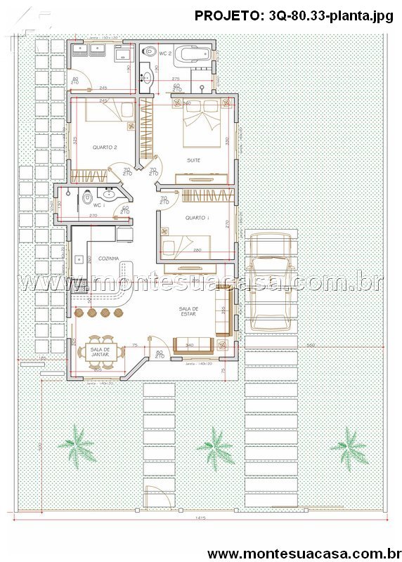 O projeto 3Q-80.33 apresenta uma casa térrea compacta e muito bem distribuída, com área total de 80,33 m². Ideal para famílias que buscam conforto, praticidade e um design moderno, essa planta aproveita cada metro quadrado de forma inteligente, proporcionando ambientes amplos e integrados.