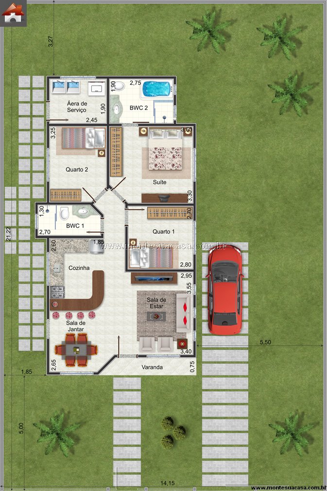 Nos fundos, o projeto conta com área de serviço coberta e bem ventilada, além de espaço reservado para lazer ou jardim. A frente da casa oferece vaga para um carro, com acesso direto à varanda e ao hall de entrada.