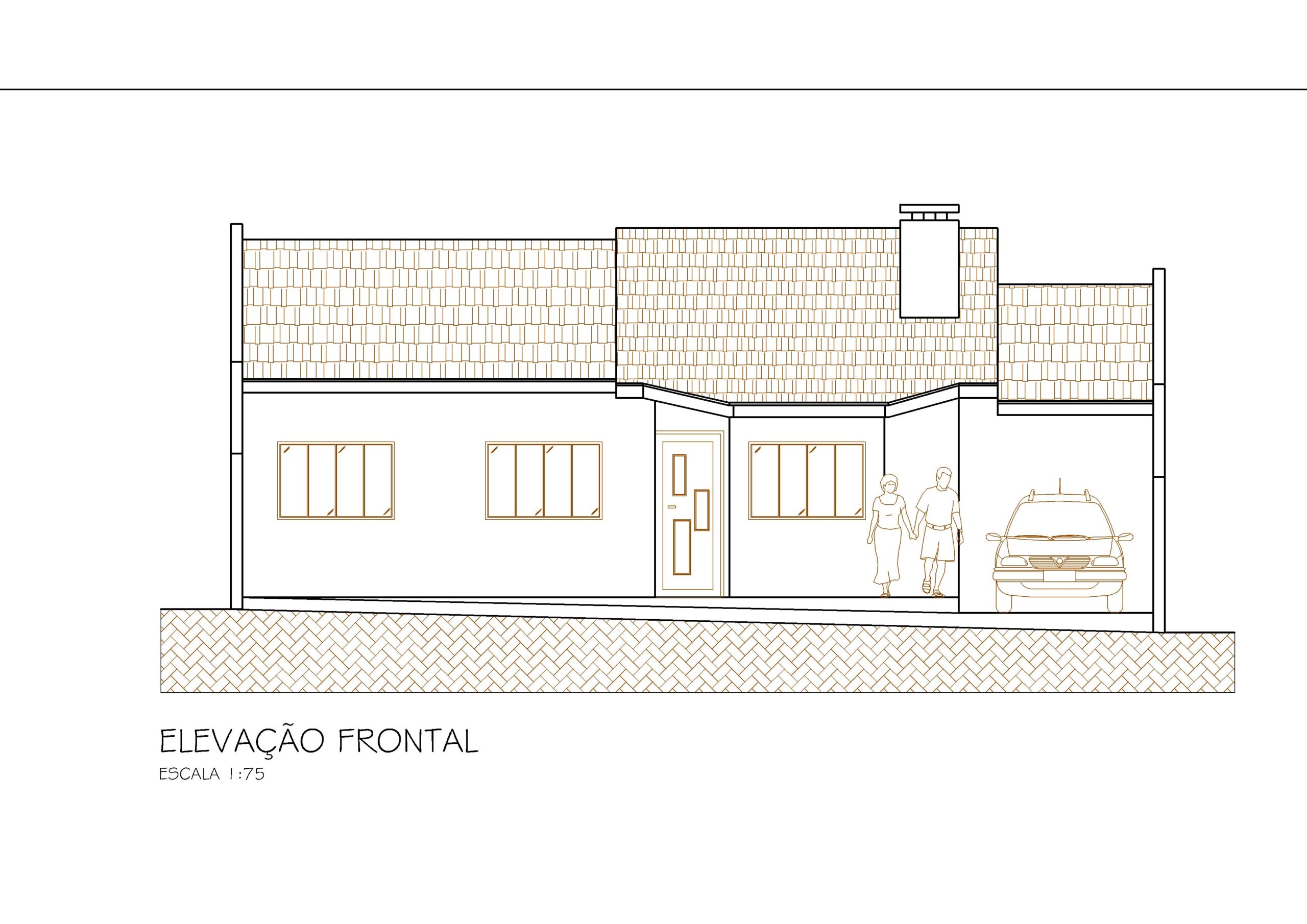 A fachada apresenta um design simples e acolhedor, com telhado em duas águas e linhas tradicionais, transmitindo uma sensação de equilíbrio e aconchego. O destaque fica para o avanço da garagem coberta, que oferece proteção ao veículo e cria uma varanda agradável junto à entrada principal.
