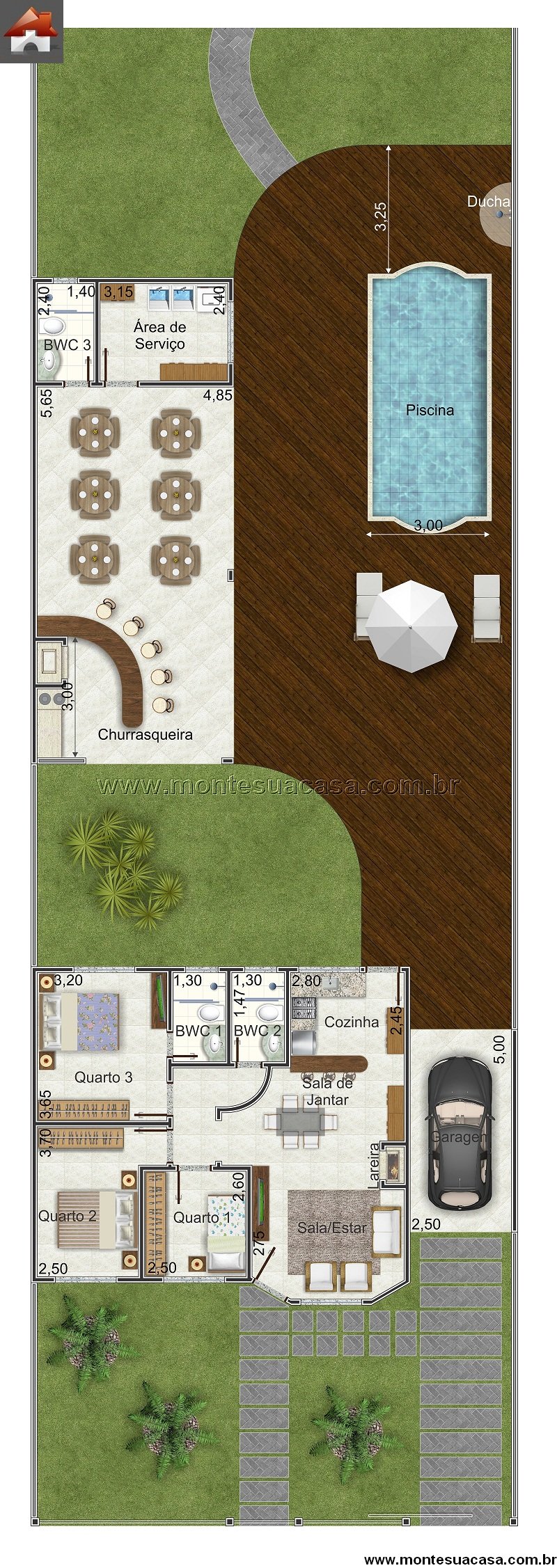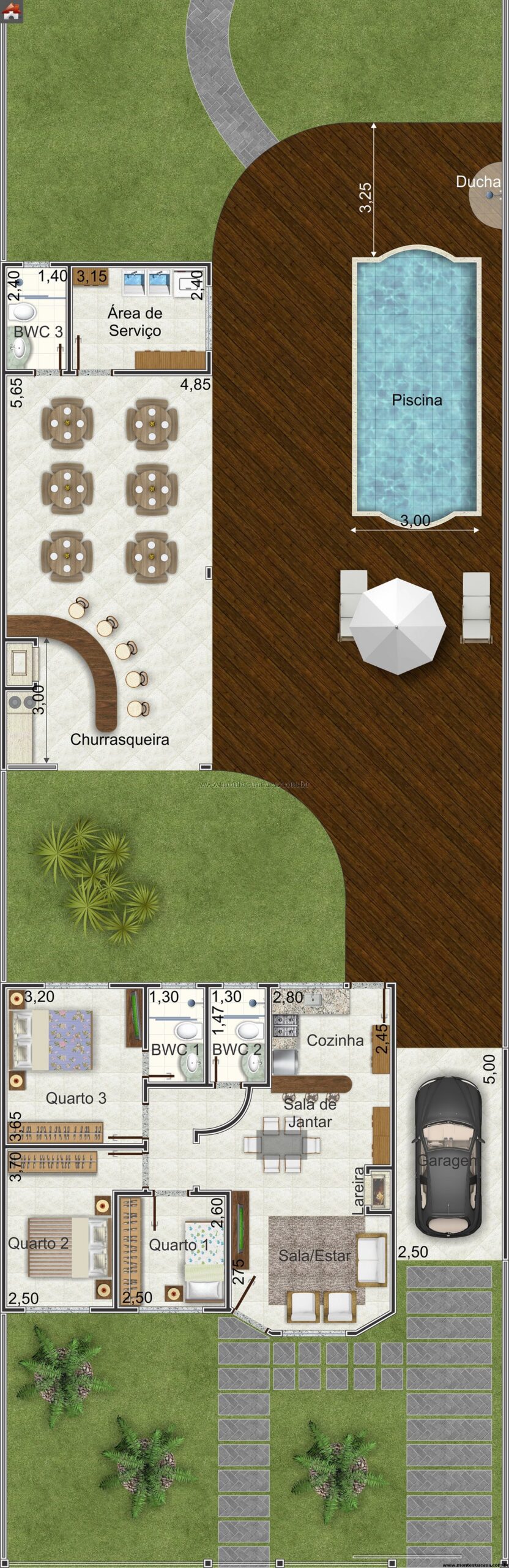 Projeto de Casa Térrea com 3 Quartos, Piscina e Churrasqueira