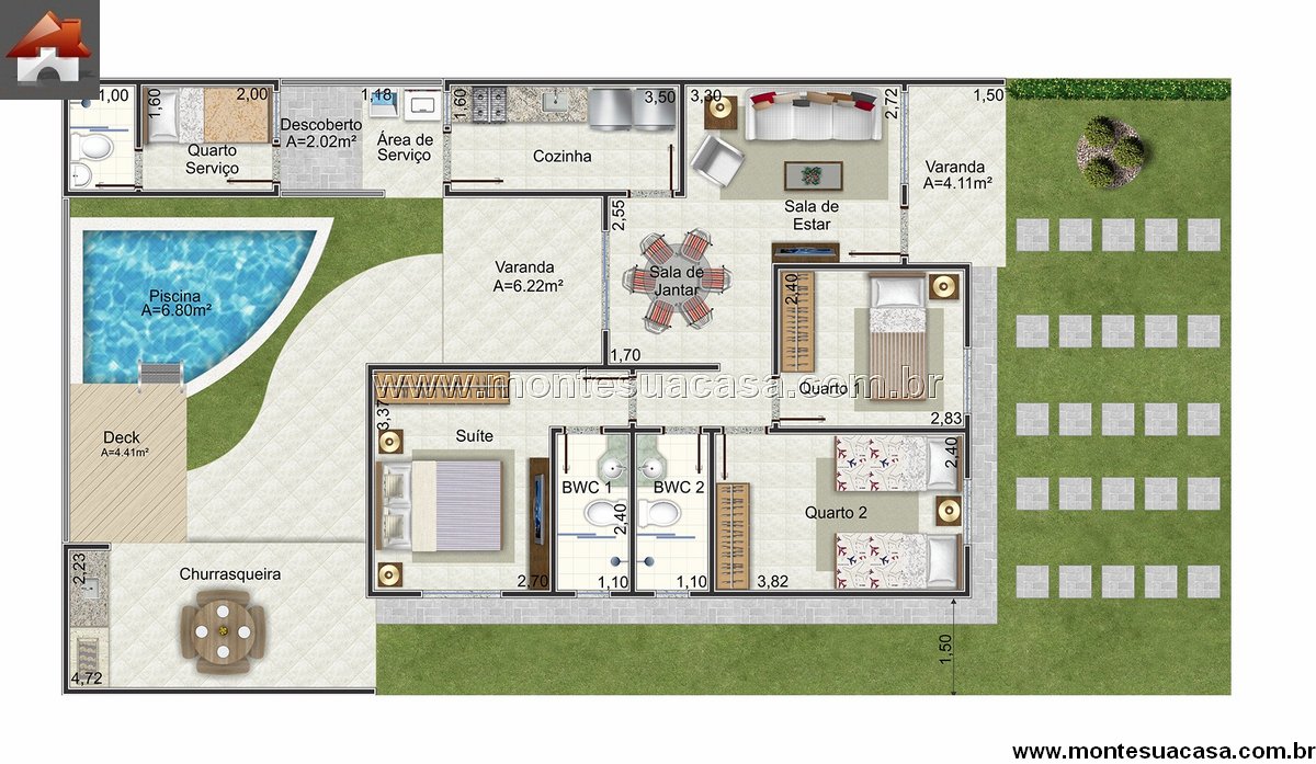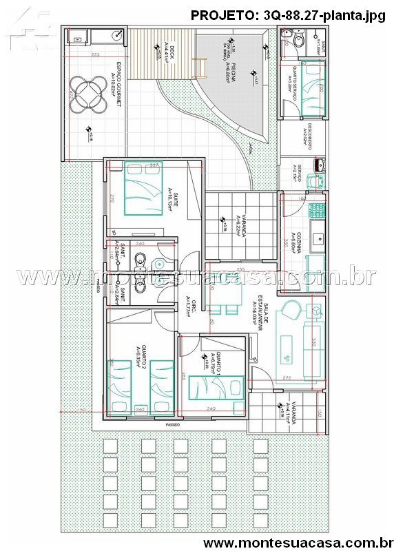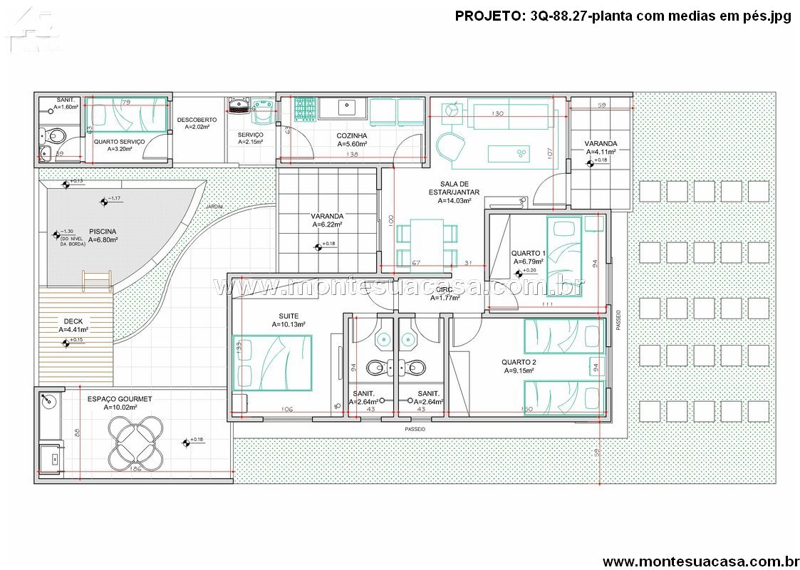 Com excelente custo-benefício, o modelo 3Q-88.27 é ideal para quem deseja construir uma casa aconchegante, de fácil manutenção e com áreas de lazer valorizadas.