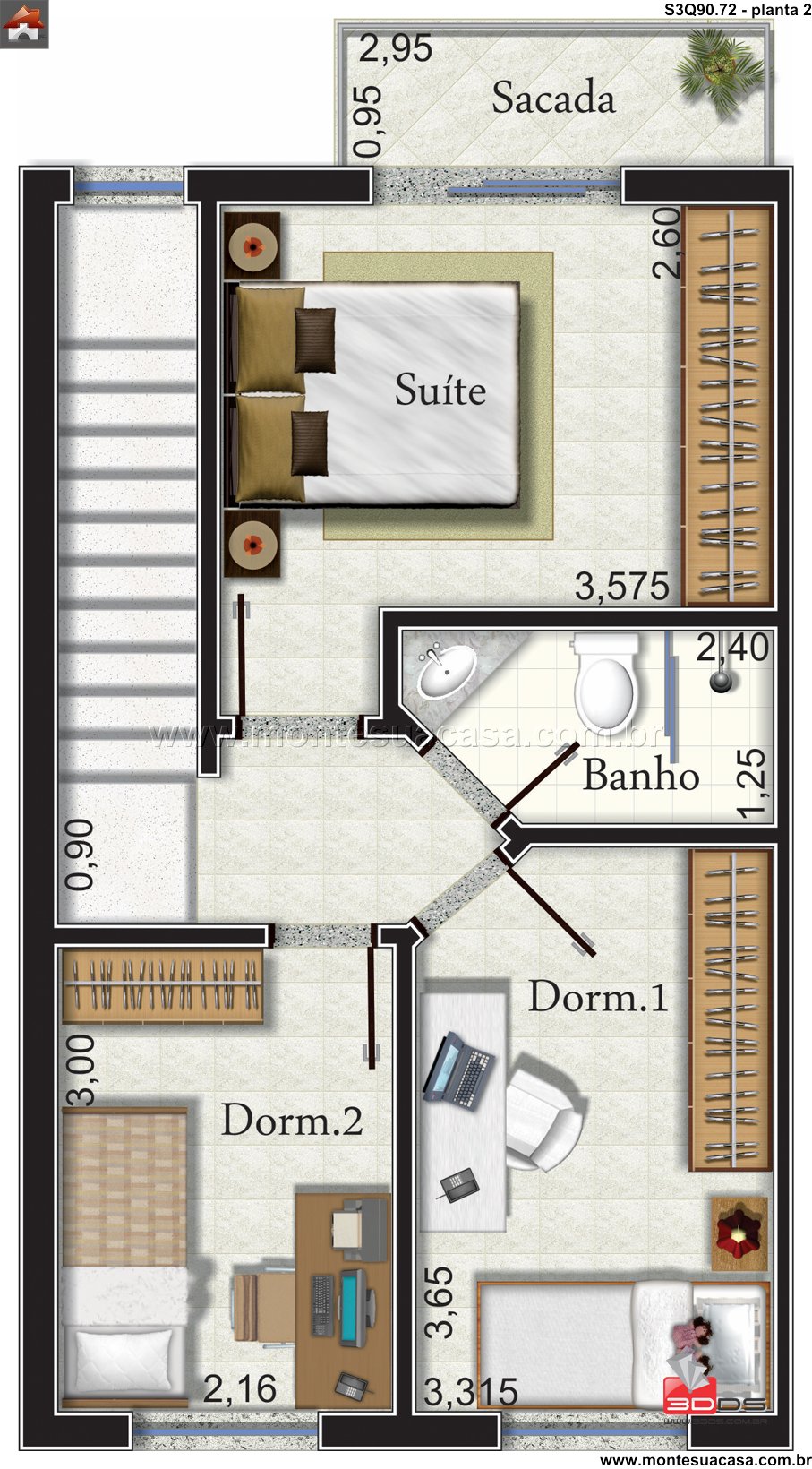 O pavimento superior organiza a parte íntima de forma clara e funcional. A suíte frontal possui acesso à sacada, garantindo ventilação, iluminação e sensação de amplitude. O espaço acomoda armários com facilidade e mantém circulação confortável. Os outros dois dormitórios, posicionados nos fundos, atendem perfeitamente famílias com filhos, home office ou hóspedes. O banheiro social completa o pavimento e distribui bem o atendimento entre os dormitórios, mantendo praticidade e conforto.