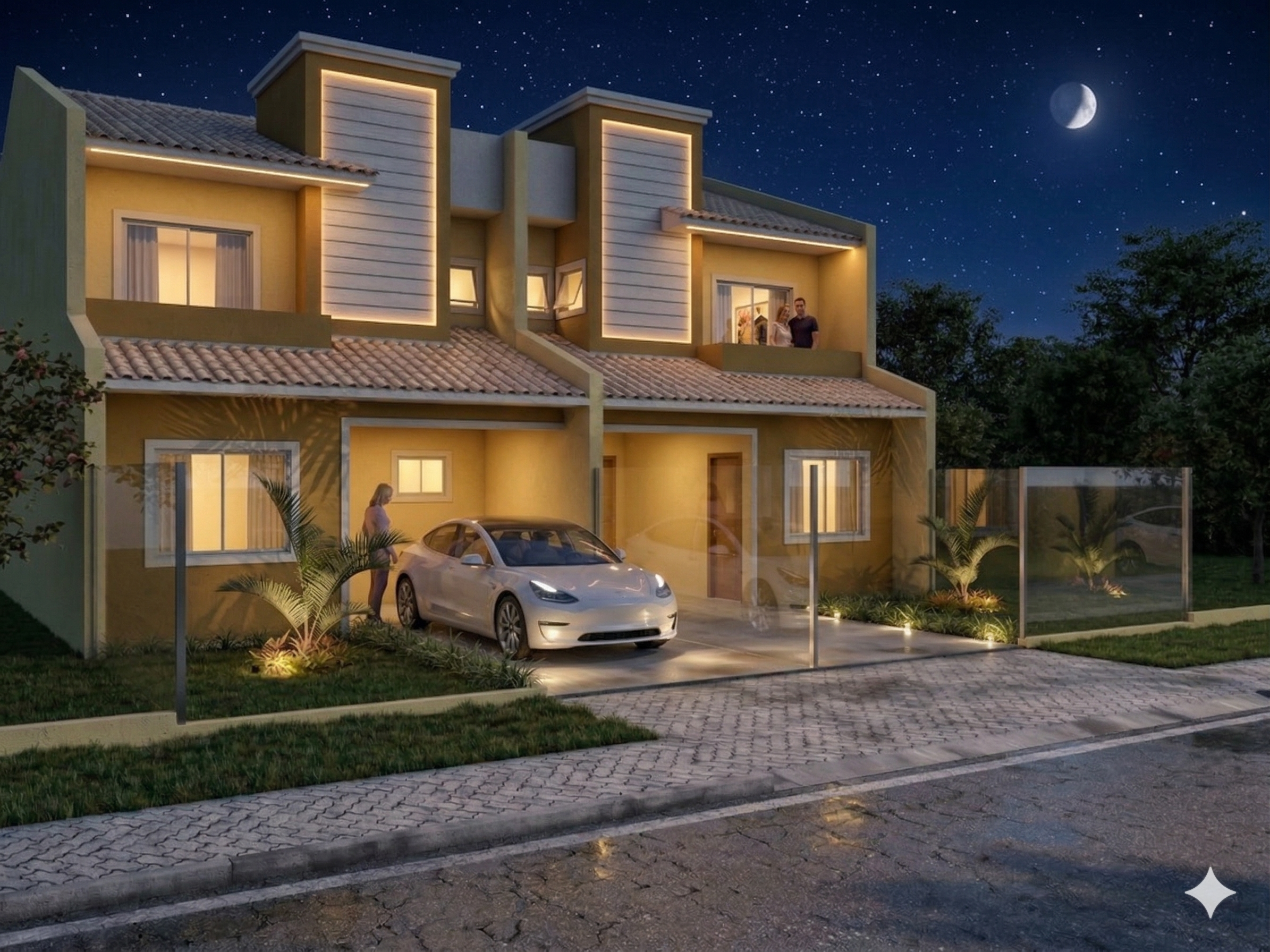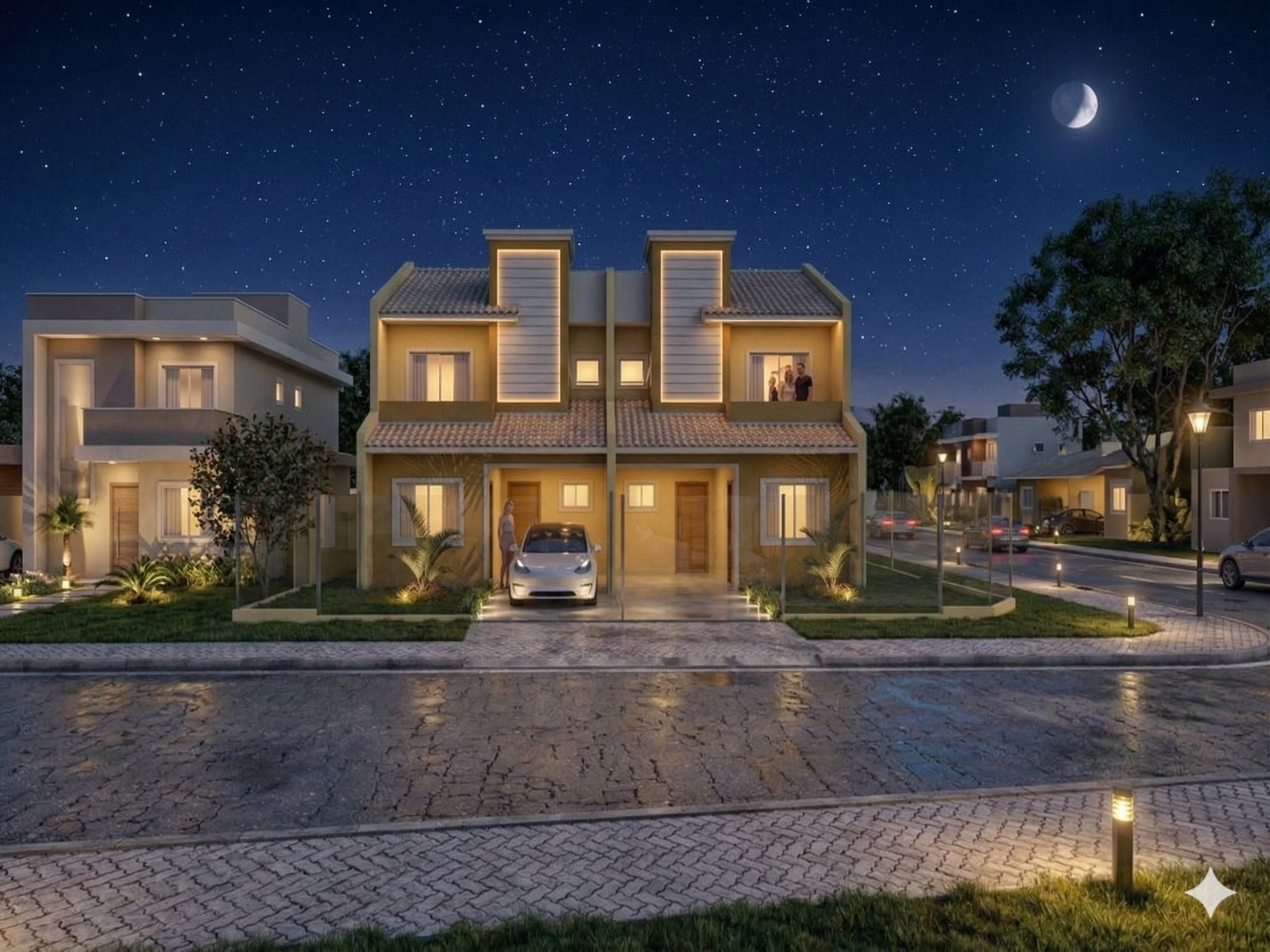 A fachada combina linhas retas, volumes bem definidos e cores em tons quentes, transmitindo harmonia e aconchego. O telhado aparente com inclinação leve reforça o estilo contemporâneo, enquanto o destaque das chaminés e o revestimento texturizado trazem um toque de personalidade. A varanda superior proporciona um espaço agradável para momentos de descanso e contemplação.