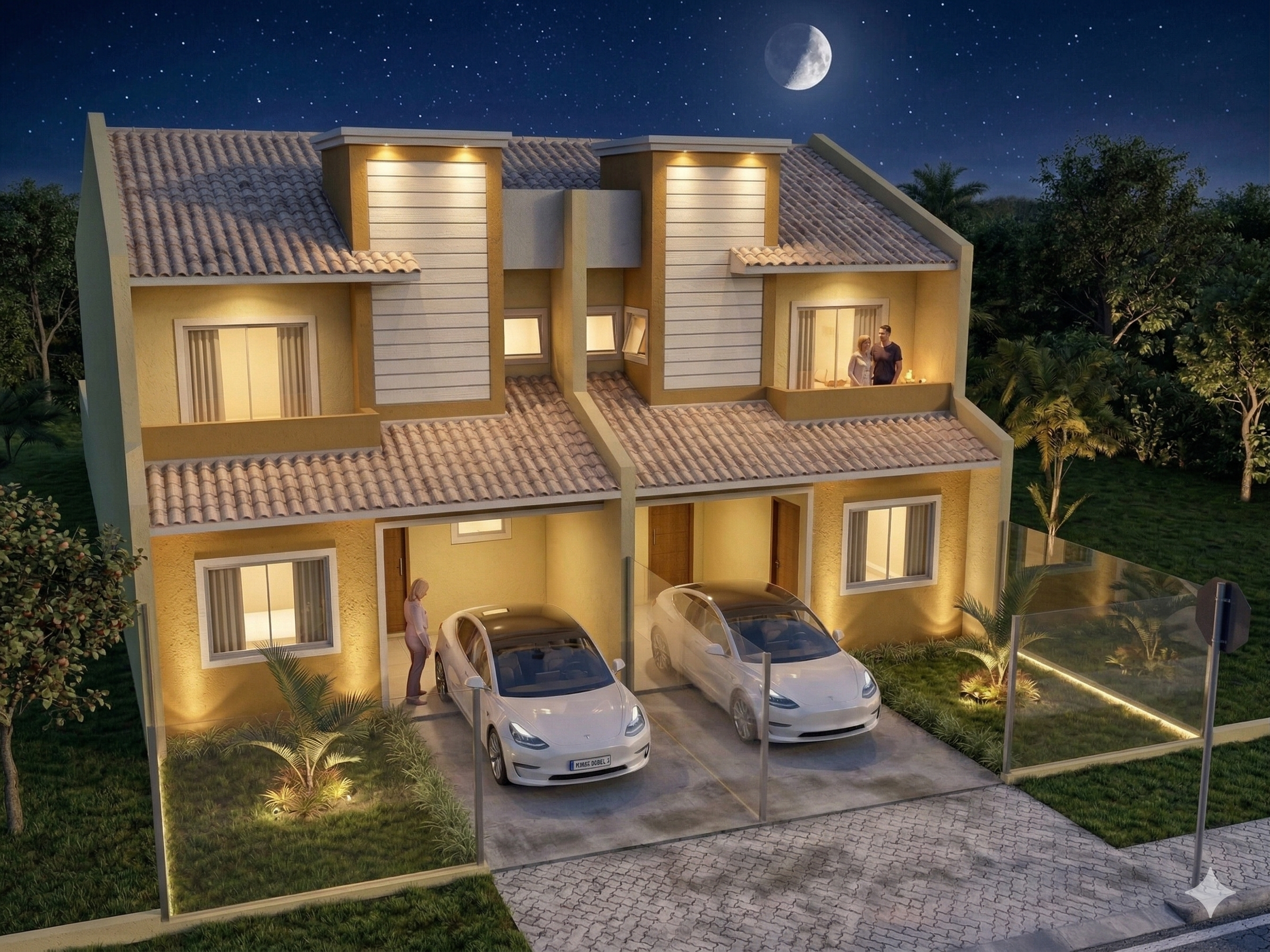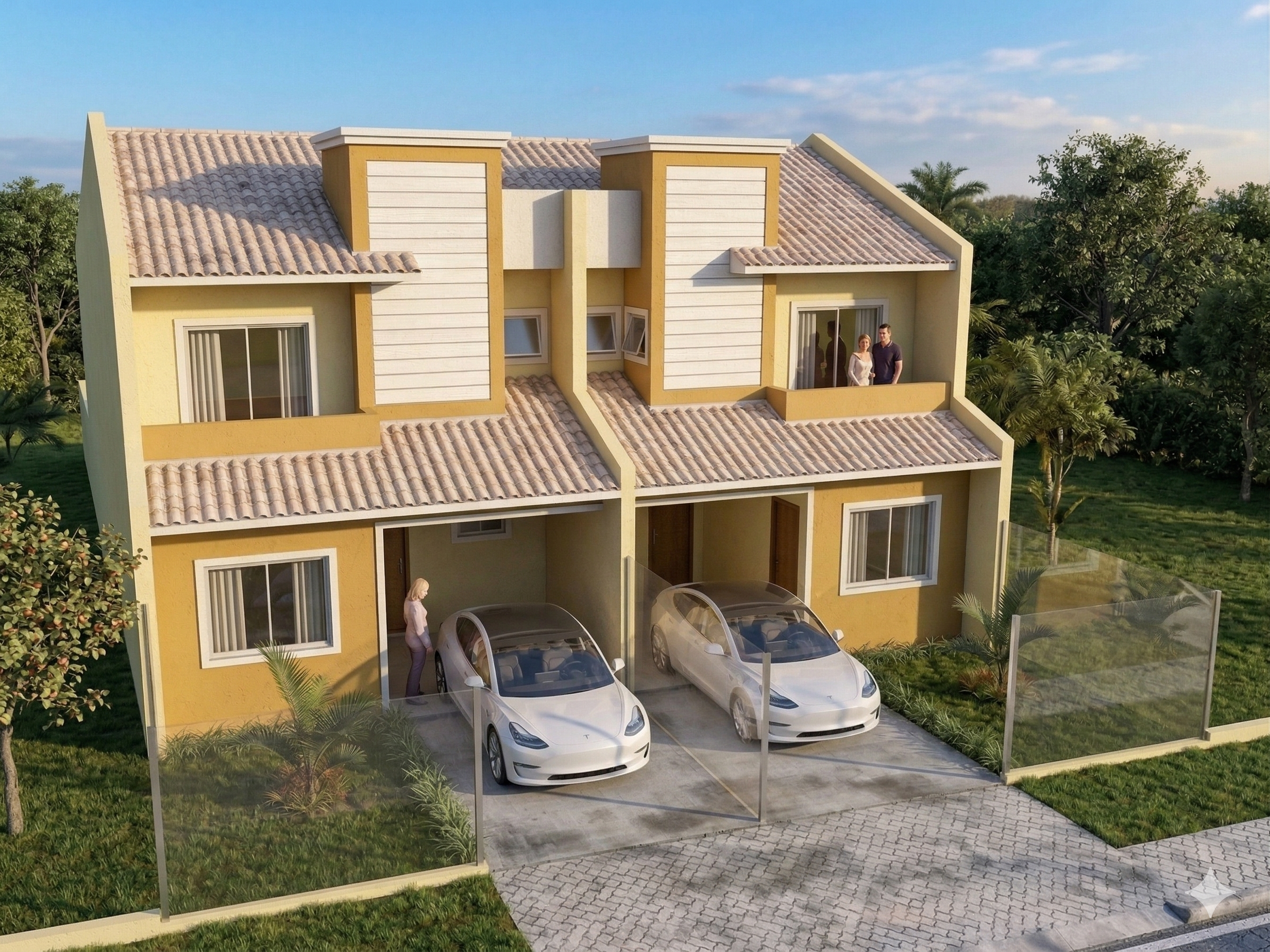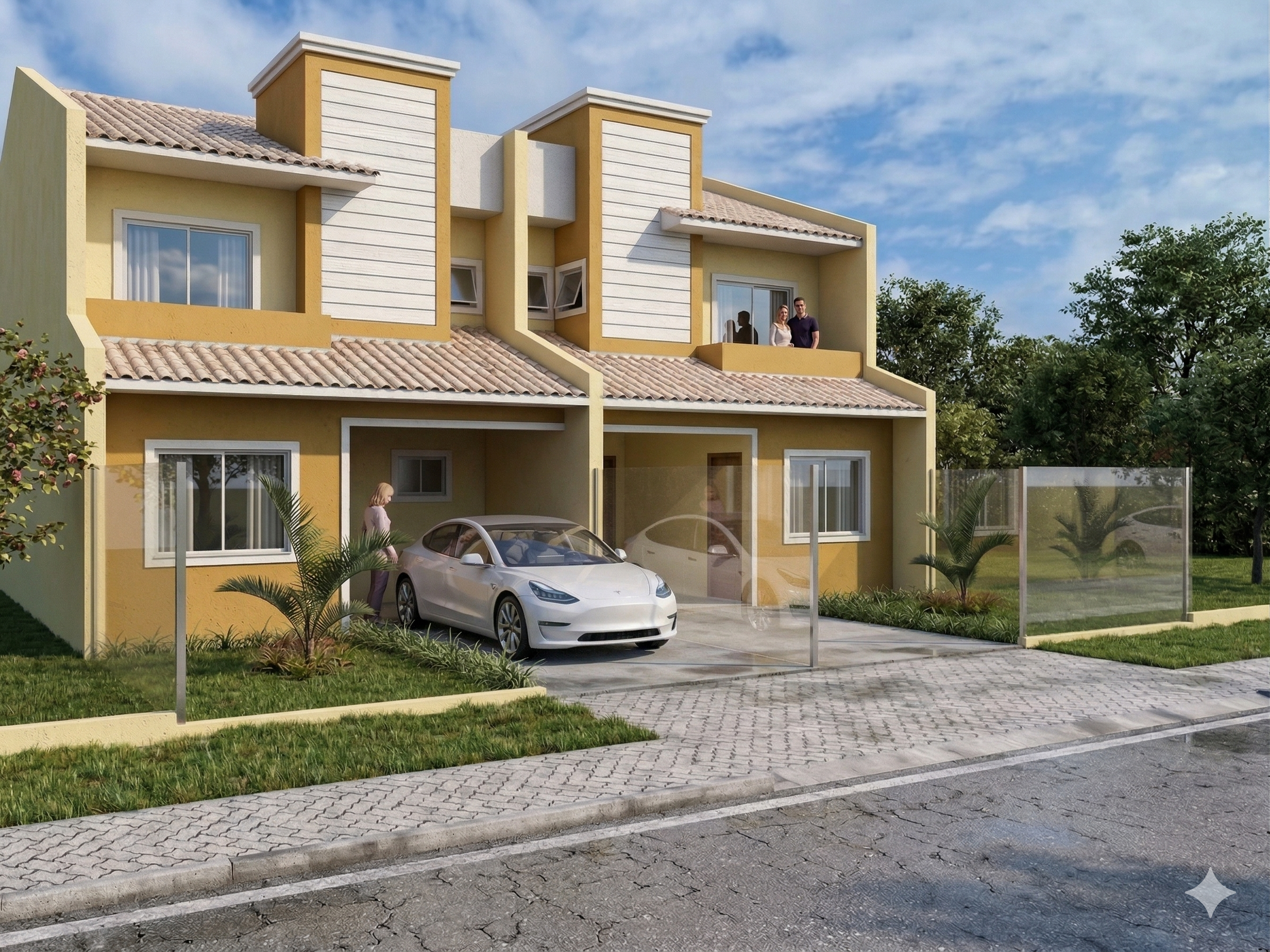 O modelo foi pensado também para construções geminadas, permitindo o aproveitamento inteligente do terreno e reduzindo custos construtivos. A disposição das janelas e aberturas garante boa ventilação e iluminação, mesmo quando implantado em terrenos vizinhos.