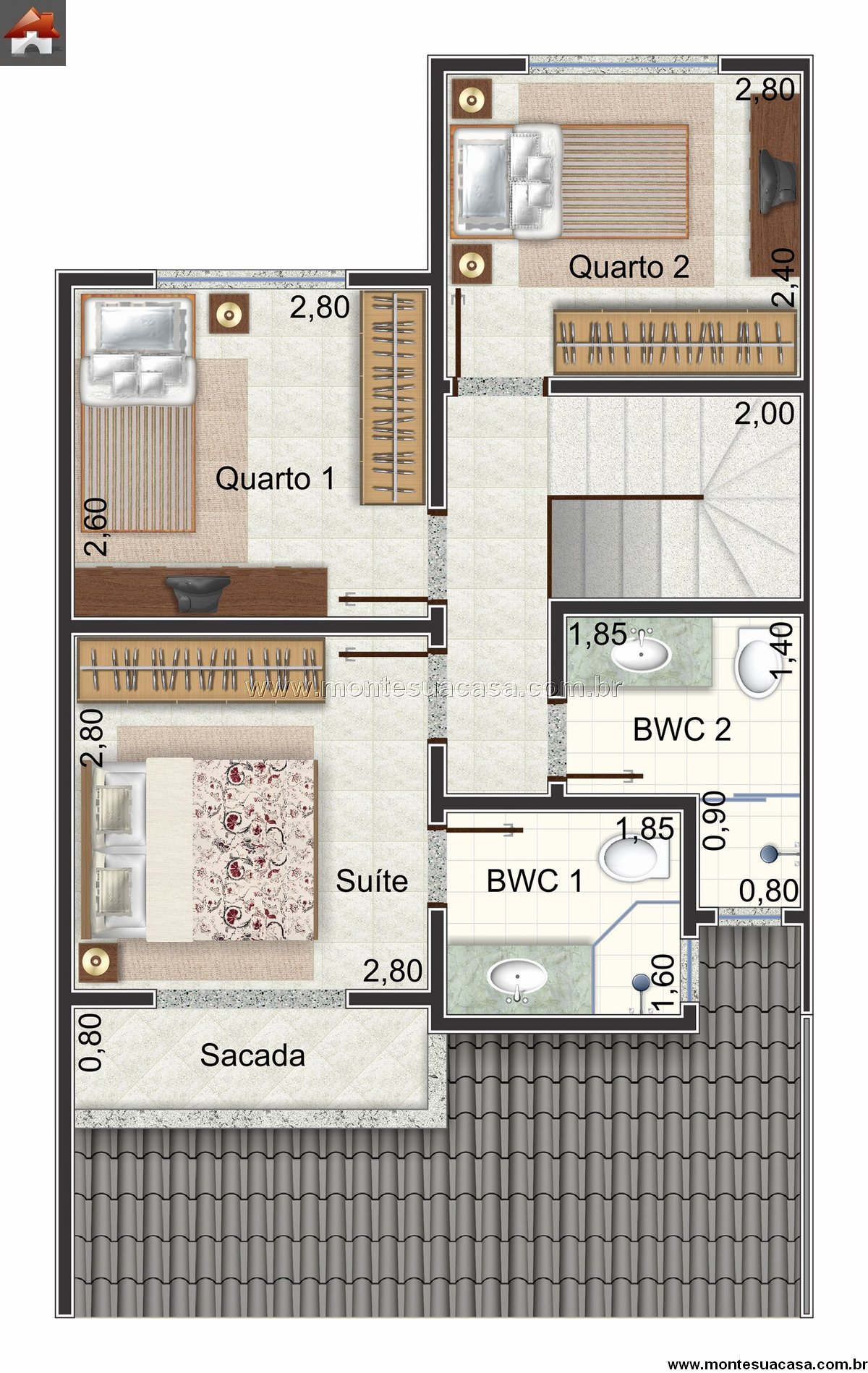 O pavimento superior é composto por três dormitórios, sendo uma suíte com sacada, além de dois banheiros completos. A circulação central garante fácil acesso aos ambientes, otimizando o layout e a iluminação natural. O quarto principal se destaca pela área generosa e pela integração com a varanda, ideal para momentos de relaxamento.