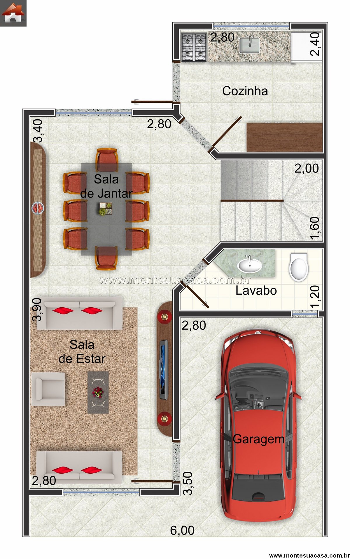 No pavimento térreo, o projeto conta com garagem coberta, sala de estar ampla e sala de jantar integrada à cozinha, formando um ambiente fluido e convidativo. O lavabo bem localizado garante praticidade para visitantes e moradores. A cozinha, posicionada nos fundos, possui fácil acesso à área externa, tornando as tarefas diárias mais dinâmicas e organizadas.