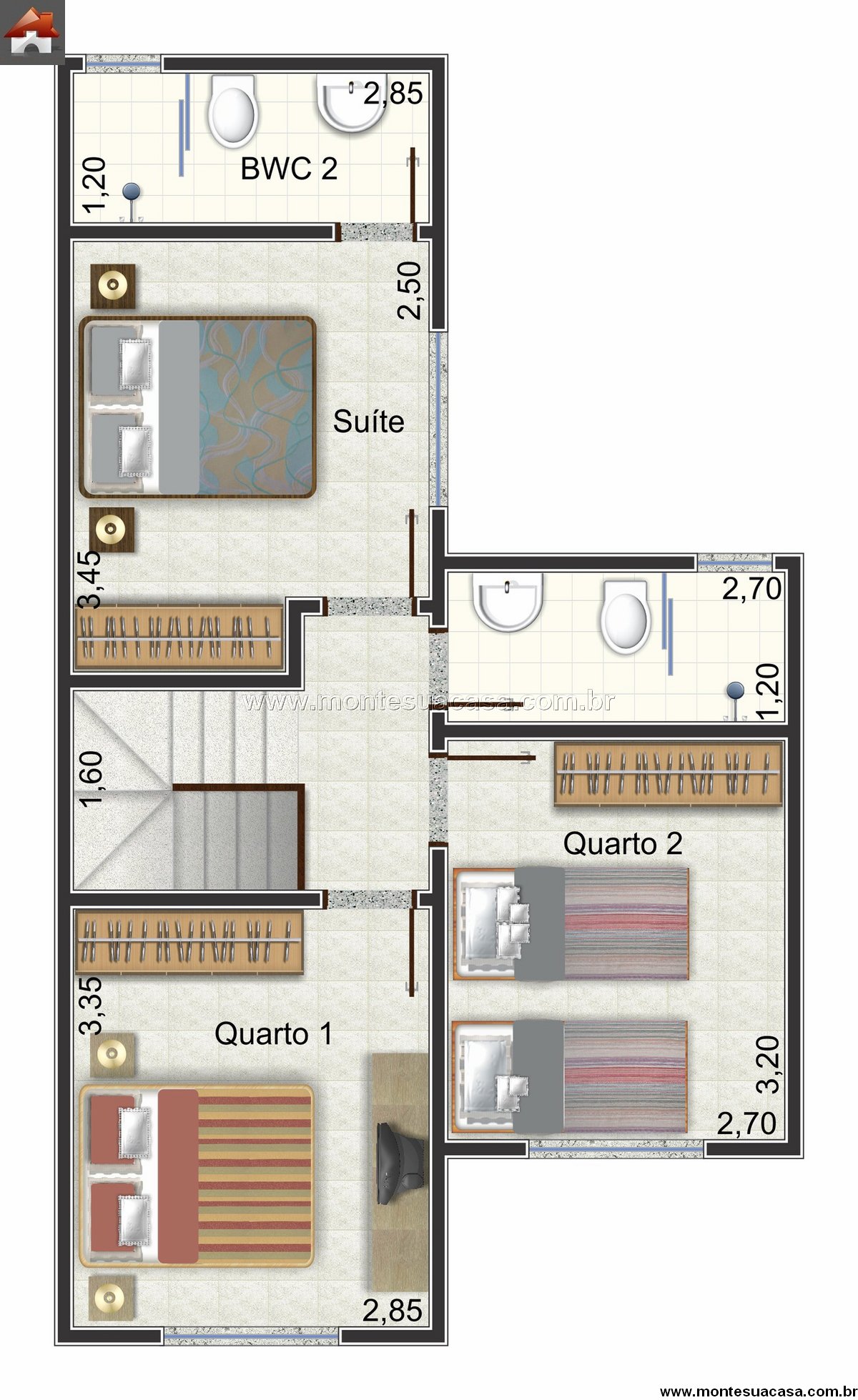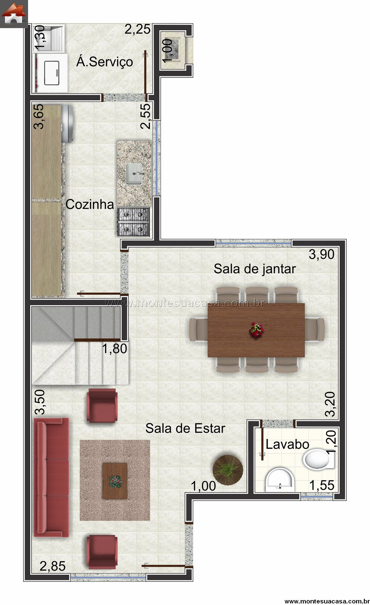 Com medidas otimizadas, o projeto adapta-se facilmente a terrenos estreitos ou de metragem reduzida, sem abrir mão do conforto. É a escolha perfeita para famílias que desejam uma casa moderna, funcional e aconchegante, com todos os ambientes essenciais distribuídos de forma equilibrada.