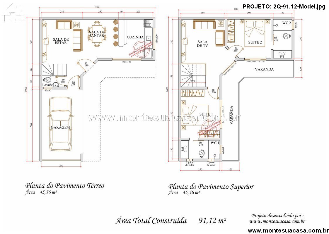 O projeto apresenta um sobrado moderno de 91,12 m², ideal para famílias que buscam conforto, funcionalidade e design contemporâneo. Sua fachada combina telhado cerâmico tradicional com linhas retas e amplas aberturas, proporcionando ventilação natural e excelente iluminação para todos os ambientes.